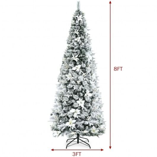 ? 339/471/627/807 (5 ft/6 ft/7 ft/8 ft)branch tips create a full-body look ? Snow flocked leaves create a unique wintry feel ? High-quality PVC and PE branch tips with exquisite craftsmanship ? Hinged design allows easy assembly disassembly and storage ? Folding metal stand provides strong support and great stability ? Pure white berries and lily-white poinsettia flowers create an elegant and luxurious look