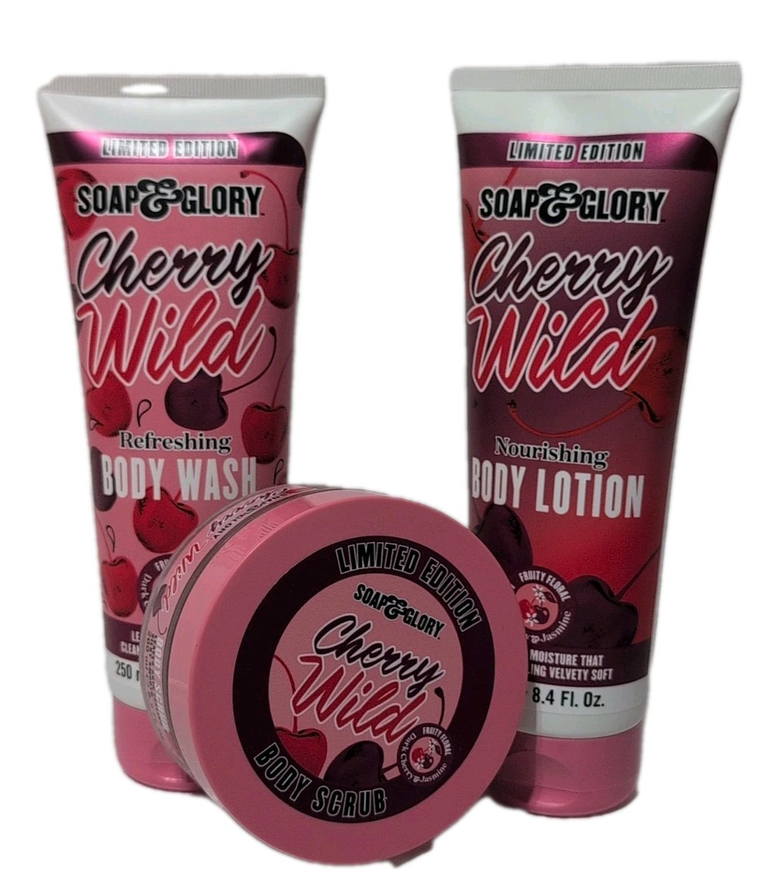 - Soap & Glory Limited Edition Cherry Wild Body Care Set 3 Pc Lotion Wash & Scrub