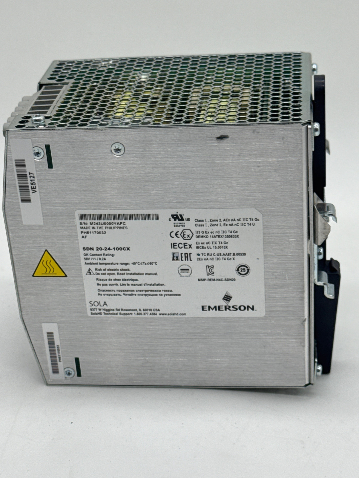 - Sola/Emerson SDN 20-24-100CX Power Supply, In 100-240VAC/DC Out 24VDC 20A 480W