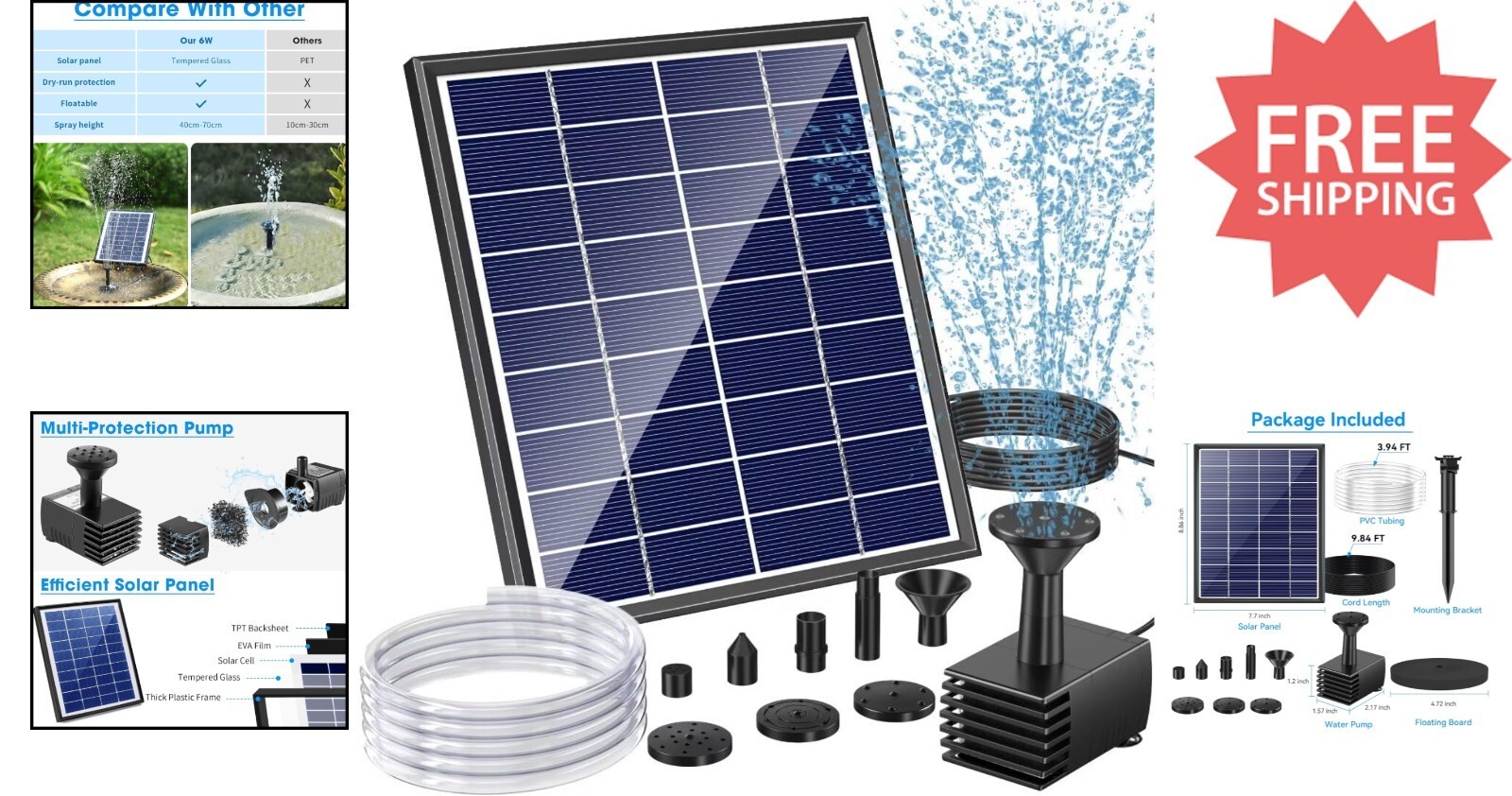 - Solar Bird Bath Fountain Pump - 6W Glass Panel with 5 Nozzles & 4ft Tubing