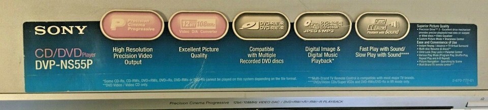 Experience high-quality entertainment with this Sony CD/DVD player that supports numerous playable media formats such as CD and DVD. This DVD player is an excellent addition to any home entertainment system. It is a model DVP-NS55P that comes with features like DVR/Hard Drive Recorder and Connectivity options like Composite Video RCA, Stereo Audio L/R RCA, and Digital Audio Coaxial RCA.