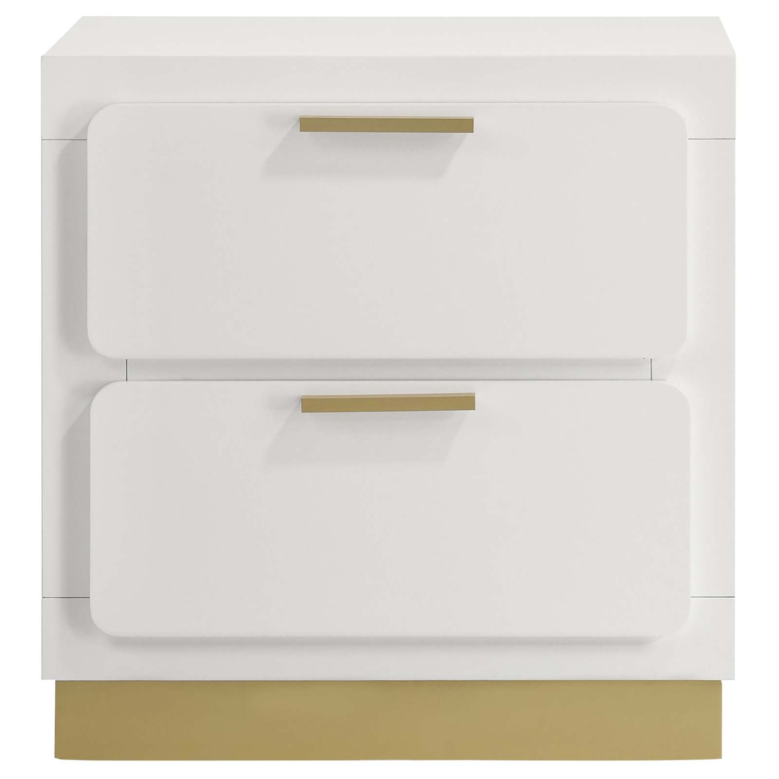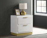 This contemporary nightstand blends sleek form and practical function, featuring two drawers for convenient bedside storage with a bold black base and metallic gold accents for a striking contrast. The stylish bar drawer pulls, recessed base, and smooth metal glides offer both sophistication and ease of use, making it the perfect addition to modern bedrooms.