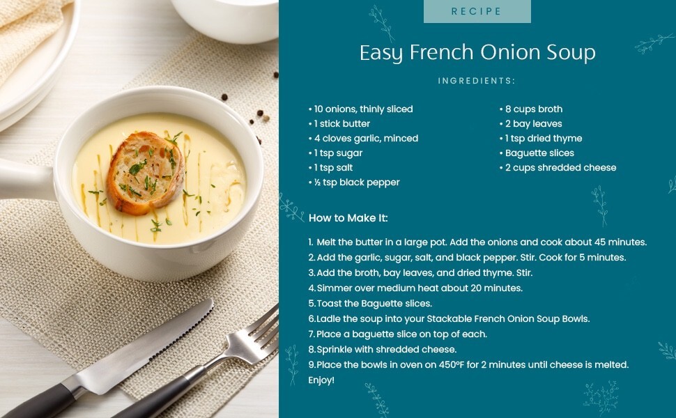 These durable ceramic crocks are designed with a large stay-cool handle for breezy oven-to-table transfer. Perfect for everything from individual pot-pies, stews, soups, deserts and casseroles to our personal favorite; gooey, cheesy French Onion Soup! Cook ?n serve. Each crock is designed with a large, comfort-grip handle for easy and safe carrying. Designed with a large 15 oz capacity that?s perfect for generous personal portions. They are oven, dishwasher, microwave and freezer safe for maximum convenience. Add a rustic touch to your dinner table. Crafted from durable and chip-resistant stoneware in a variety of vibrant colors (Choose your favorite color from the drop-down menu at the top of this listing). We?ve carefully packaged these French Onion Soup Crocks in custom polyfoam molds to ensure they arrive in perfect condition!