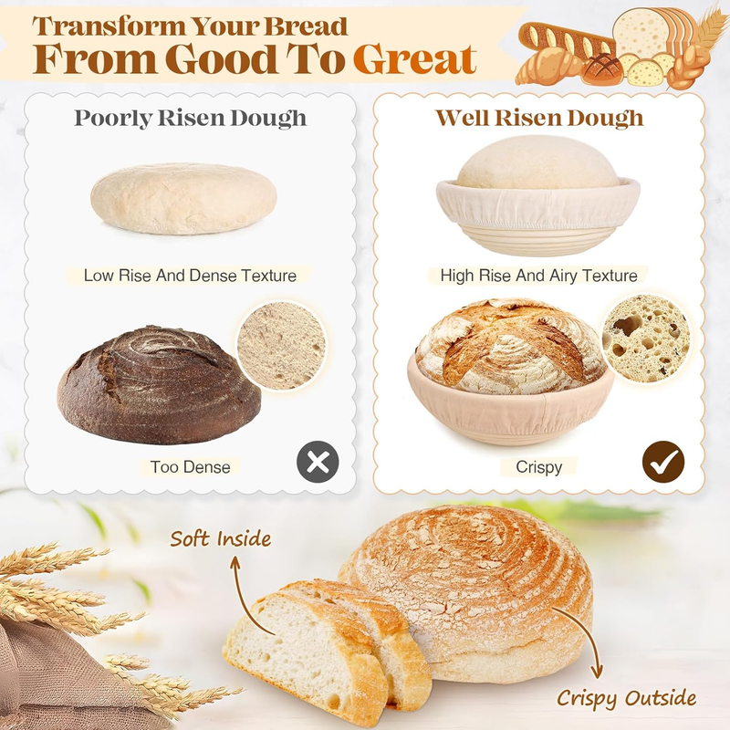 ?CREATE STUNNING SOURDOUGH EVERY TIME - Our premium sour dough proofing baskets are crafted from high-quality Indonesian rattan with a smooth, splinter-free finish that perfectly maintains dough structure while imprinting beautiful spiral patterns. They?re also easy to clean, which is important since I bake bread regularly. The included all-natural linen liner provides a completely chemical-free, non-stick surface for consistently perfect loaves. With this professional bread making kit, you'll be amazed at the restaurant-quality bread you can create at home.