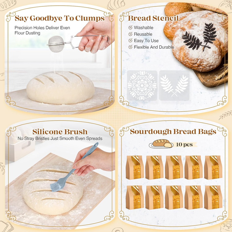 ?GREAT SOURDOUGH ACCESSORIES KIT FOR GIFTING - Meticulously crafted for unforgettable gifting moments - birthdays, housewarmings, weddings, or just because - this premium bread making accessories kit arrives in elegant, gift-ready packaging that impresses at first sight. The sourdough basket gives your loaves perfect shape and texture, while our homemade bread accessories help achieve that coveted crispy crust and airy interior. This breadmaking tools and supplies kit transforms any kitchen into a professional bakery, making store-bought bread a thing of the past!