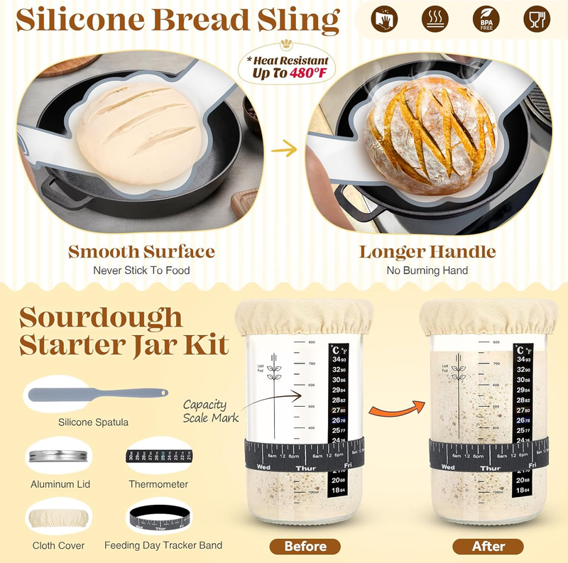 ?OUR SOURDOUGH STARTER SET IS AN EXCELLENT CHOICE - Experience effortless dough mixing with our ergonomic Dough Whisk. Sharp blades for beautiful scoring patterns. and elevate your loaves with decorative stencils for picture-perfect designs. Our innovative silicone bread sling ensures seamless oven transfers, while breathable bread bags for homemade bread maintain perfect crust texture. Just unbox and start restaurant-quality sourdough bread made simple in your own kitchen!