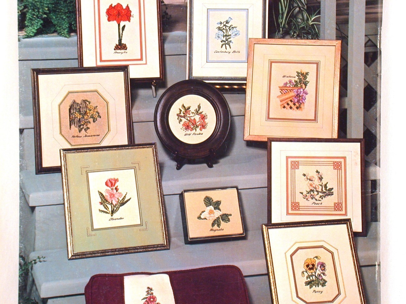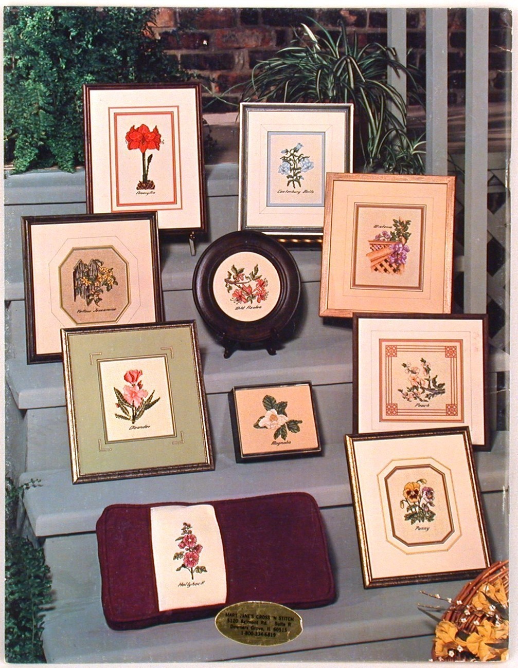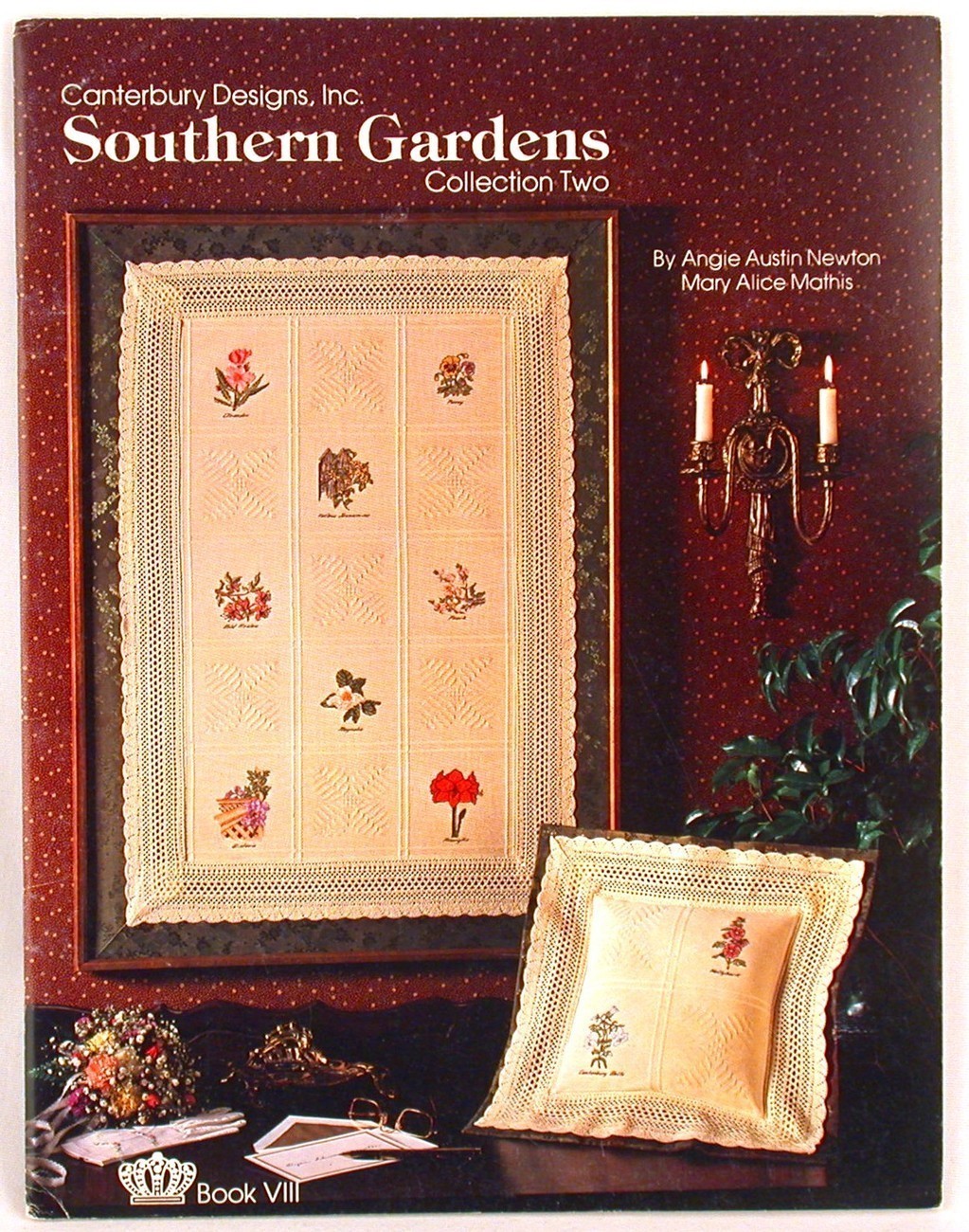 Southern Gardens Collection Two, Book VIII from Canterbury Designs, Inc., designed by Angie Austin Newton and Mary Alice Mathis, contains 10 cross stitch patterns for flowers, 1982. The flowers are magnolia, wild azalea, yellow jasmine, oleander, amaryllis, peach and border, hollyhock, pansy, Canterbury bells and wisteria. 21 pages. Previously owned but in excellent, clean, nearly new condition.