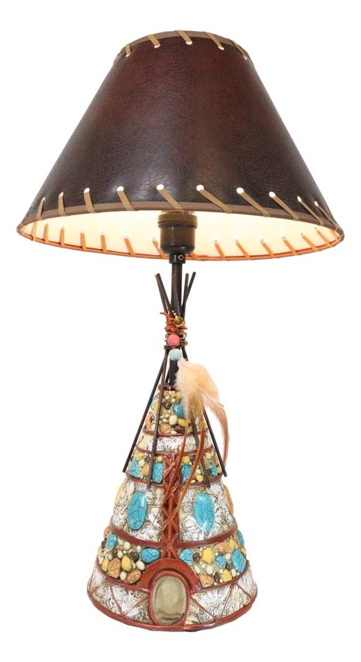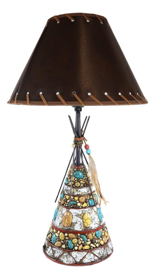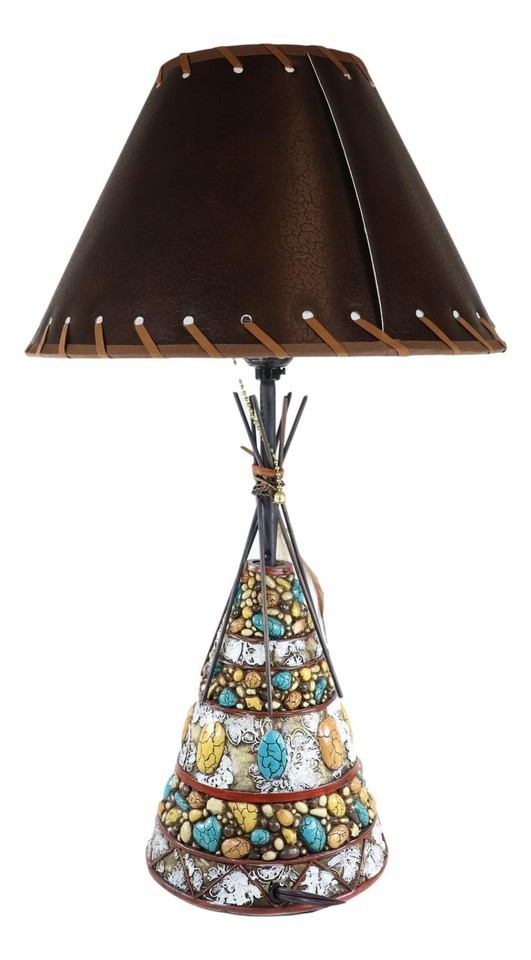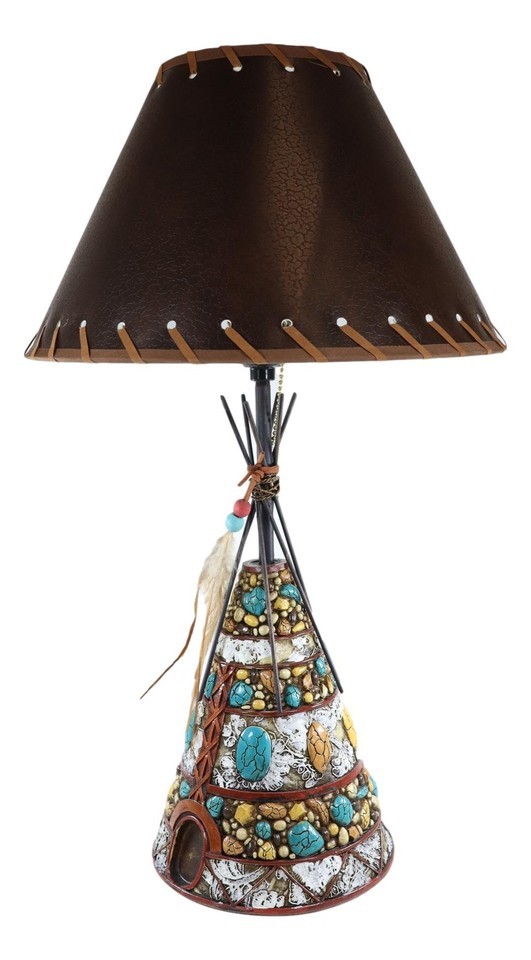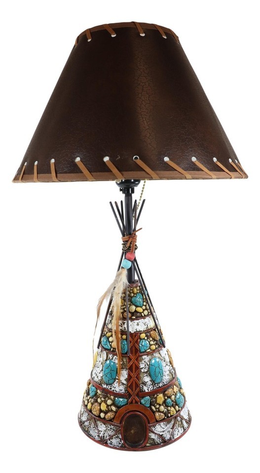 ? Add a touch of western frontier to your home or office with this Indian Teepee Hut table lamp. This decorative teepee sculpture is beautifully designed with turquoise rocks, earthy stones, wooden stick anchor frames and the dreamcatcher feathers.