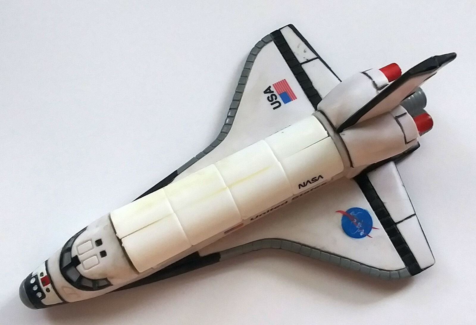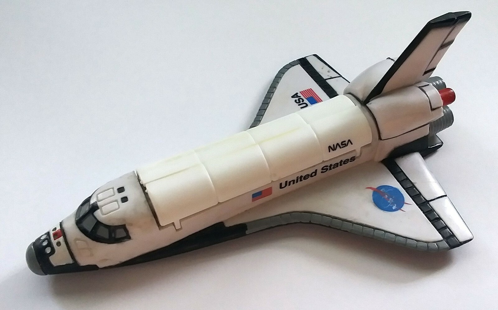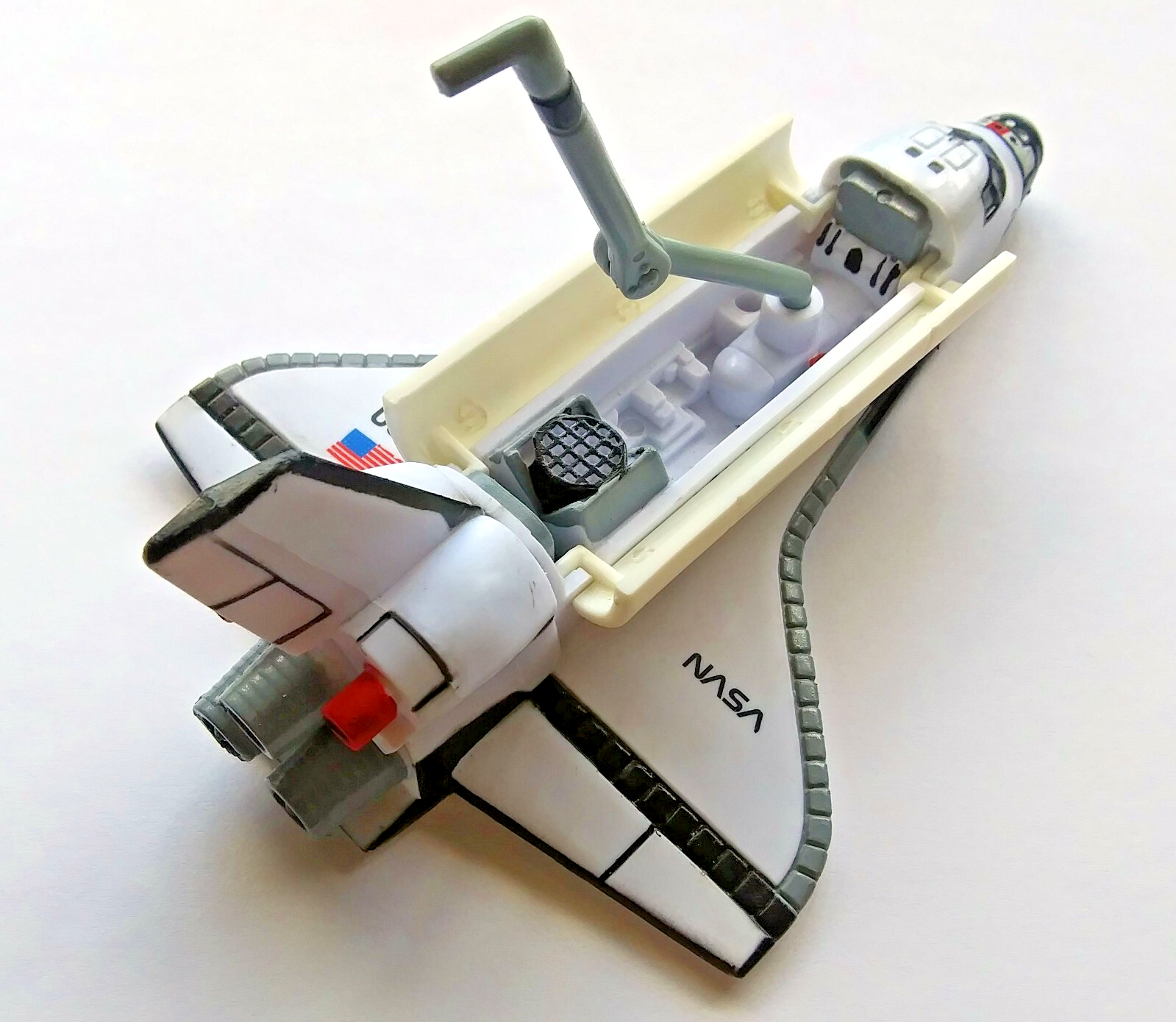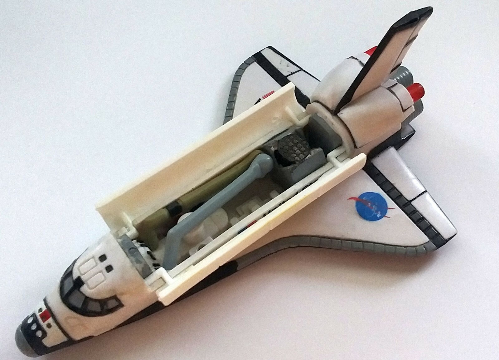 This is a never played with, only stored away for 27 years, NASA Space Shuttle orbiter, from 1998. It's made of hard plastic, and is a tiny bit under 6 inches long. It has a removeable robot arm, used for moving equipment in and out of the cargo bay. The cargo bay doors open and close as well. This was a NASA collectable, part of the Space Explorers collectible series. There are some marks on it from manufacturing and from storage but no major damage on it and it was never used as a toy, only stored away.