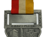 Spanish American War, United States Veterans of War, 36th National Encampment badge with an oversized aluminum drop name holder with a brass ?AIDE? pinback brooch with an open loop catch. The reverse of the upper bar of this aluminum drop name holder is marked ?ARTHUR VON SENDON CO, PITTSBURG, PA. The upper portion of the ribbon has become detached and was held into place by a piece a tape and a stick pin. Otherwise, this is in mint condition. This encampment was held August 19-23, 1934 as displayed on this badge.