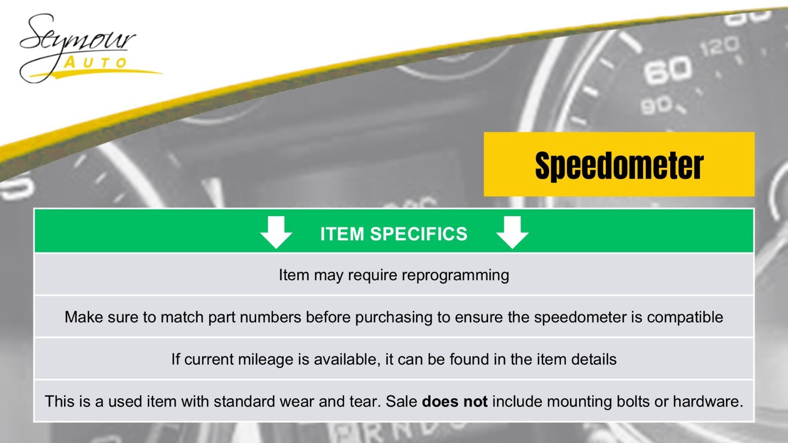 All parts listed as, Pick Up Only, will be held at Seymour Auto Wrecking (107 New Haven Rd, Seymour CT 06483) for the buyer.