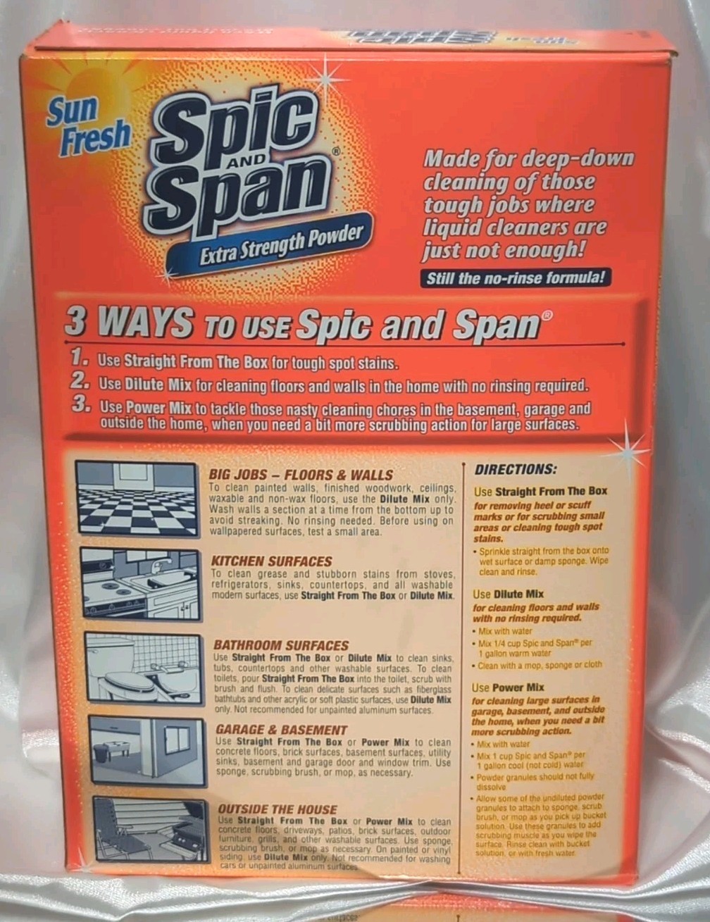 Clean tough messes with the trusted power of Spic and Span Extra Strength Powder in the fresh and invigorating Sun Fresh scent. This 27 oz container is discontinued and hard to find, making it a great score for fans of the original formula.