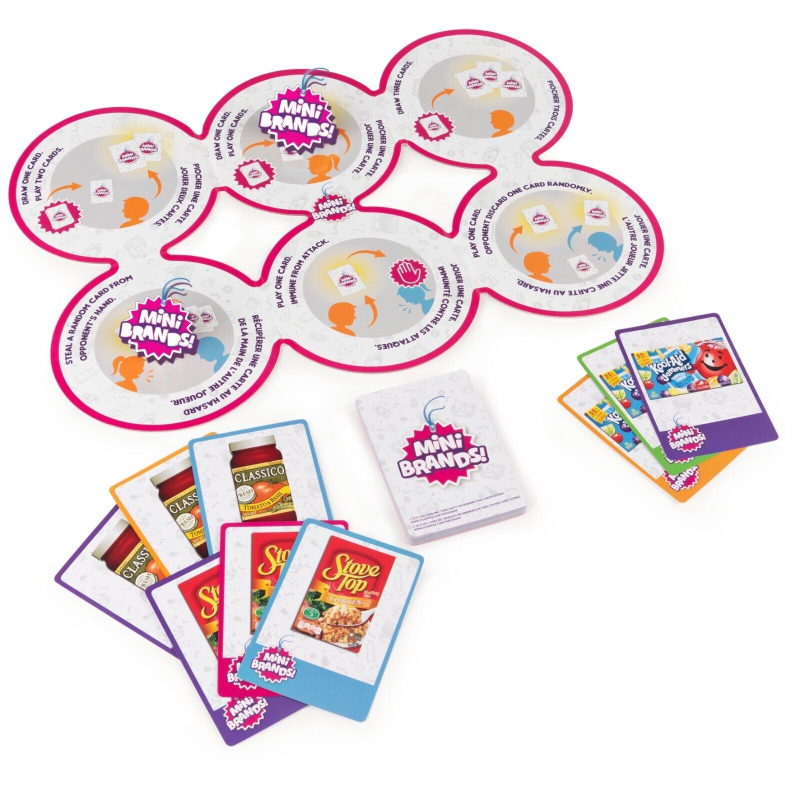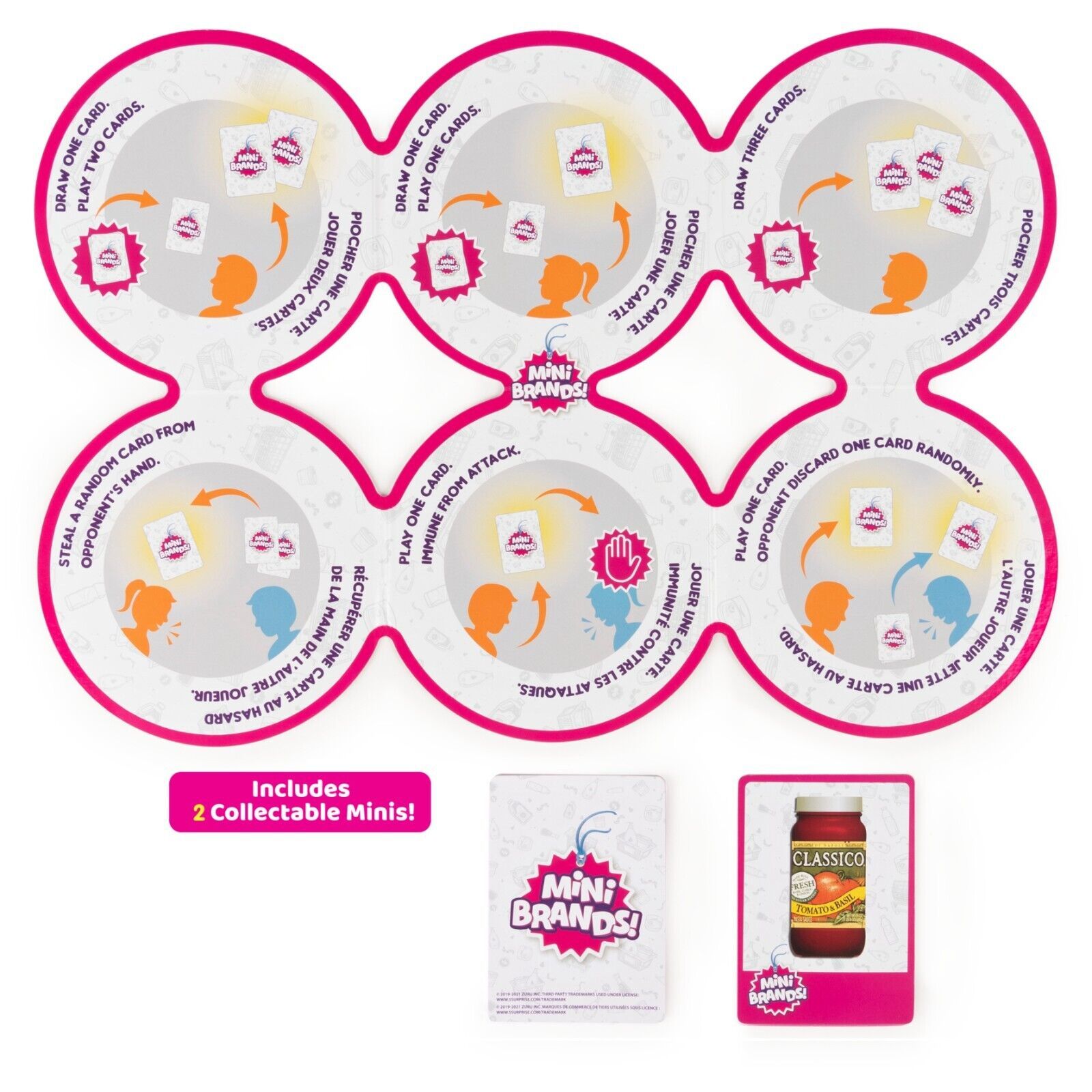 A SUPERMARKET FULL OF FAVORITE BRANDS: Race through the supermarket, trying to collect 3 sets of 3 matching Mini Brands cards. Plan your next move with Action Cards, but beware ? your opponent could do the same to you!