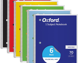 Oxford 1 Subject Wide Ruled Notebooks now come in a convenient 6 pack, making them an essential choice for school supplies, office supplies, or home organization. Each spiral notebook features wide ruled paper with roomy lines for large handwriting; the perfect notebooks for creative writing, journaling, note taking or science lab work. Also makes a great homeschool or preschool tool for beginning writers. The durable wire binding prevents snags and allows smooth page turning, while perforated pages tear out cleanly with no messy edges. Each page is 3-hole punched, ready to be stored in any standard 3-ring binder for easy organization. These spiral notebooks come in assorted colors, helping you separate subjects or projects at a glance. Every notebook contains 70 sheets (140 pages), offering plenty of writing space for daily notes or long-term projects. Detached sheets measure 7.5" x 10.5", the ideal size for classwork or office notes. These versatile notebooks are ideal for students, teachers, professionals, and writers. 6 Pack with assorted color covers. Notebooks are randomly selected so cover colors will vary.