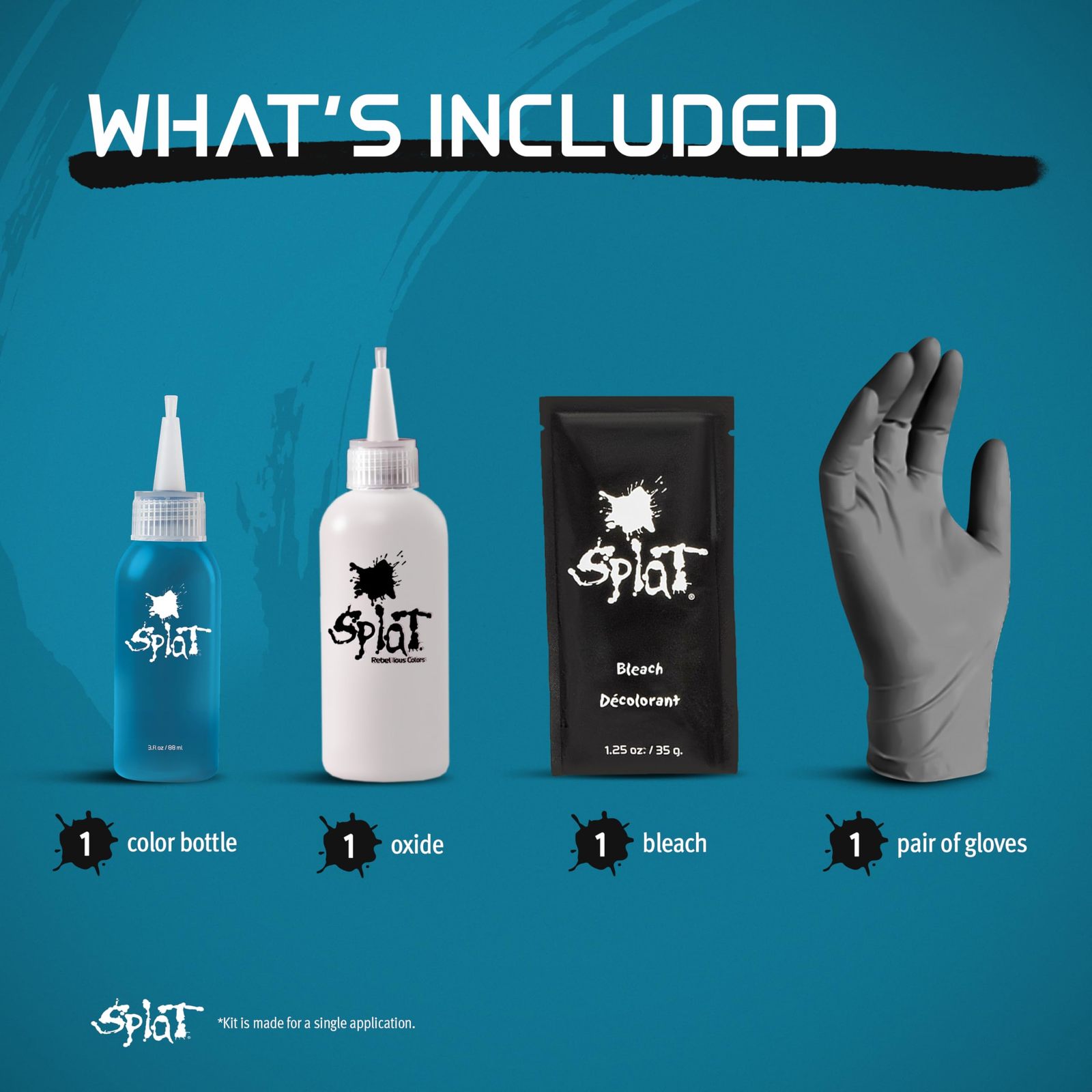 Ingredients: Splat Color Ingredients: Aqua (Water, Eau), Sodium Acryloyldimethyltaurate/VP Copolymer, Benzyl Alcohol, Glycerin, Xanthan Gum, Dehydroacetic Acid, Phenoxyethanol, Citric Acid, Disodium EDTA, Fragrance. May Contain: Acid Red 52, Acid Yellow 3, Acid Orange 7, Acid Blue 1, Basic Blue 9, Basic Red 46 Splat. Oxide Ingredients: Aqua (Water, Eau), Hydrogen Peroxide. Bleach Ingredients: Ammonium Persulfate, Potassium Persulfate, Sodium Silicate, Sodium Metasilicate, Cellulose Gum, Mineral Oil, Tetrasodium EDTA, Silica, Kaolin, Magnesium Carbonate Hydroxide, Sodium Stearate, Carbomer, Sodium Lauryl Sulfate, Fragrance, CI77007 (Ultramarines).