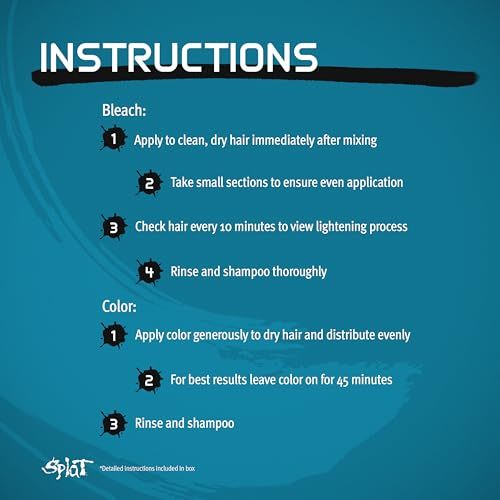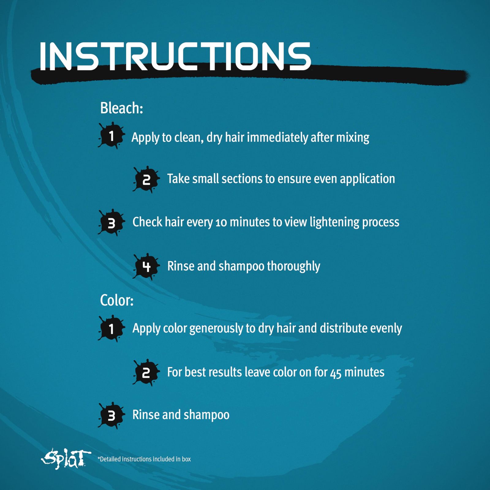 Directions: Prepare hair by washing with a clarifying shampoo and drying. Mix bleach powder and developer, apply to hair, wait 30 minutes, then rinse. Apply Splat Oxide, wait 20 minutes, rinse. Apply Pure Sapphire hair color, wait 30 minutes, then rinse. Follow with conditioner. (Refer to instructions for detailed guidance and cautionary notes.)