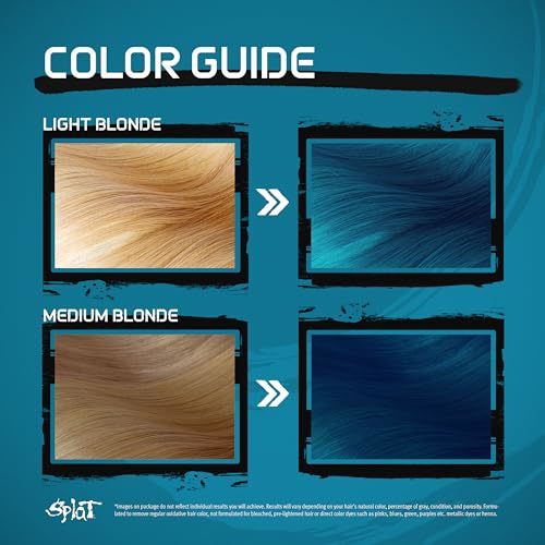 Product description: Express your creativity and individuality with a beautiful, vibrant hair color. Splat Pure Sapphire blue bleach powder lightens hair quickly, preparing your hair for intense, bright color. Made with baobab and quinoa extracts, our semi-permanent hair dye nourishes hair, improves shine, locks in color, and provides protection against breakage. Vivid hair dye kit is ideal for all-over color, streaks, ombres, or dip dyes. Includes 3-ounce bottle of Pure Sapphire hair dye, Splat oxide, lightening bleach powder, a pair of gloves, and an instruction sheet. For directions and cautions on how to apply the lightening bleach and hair dye, see instructions. Results will vary depending on your hair's natural color, condition, and porosity. For long or thick hair, 2 or more kits may be required.