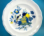 Copeland Spode Blue Bird 13" round platter or chop plate, pattern number S3274. This pattern was produced between 1958 and 1990. The pattern has a yellow basket with blue and yellow fruits, flowers and a bird. The platter has a slightly scalloped rim. Very good used condition with light amount of utensil marks on the surface and one very small chip on the underside of the rim.