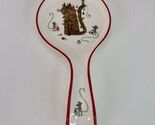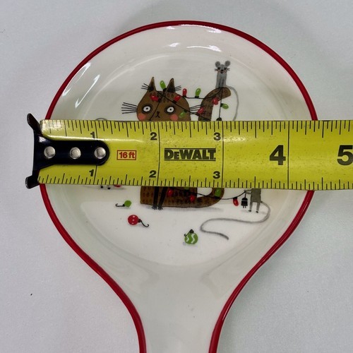 This Prima Design ceramic spoon rest features a Christmas theme with a design of a kitty cat surrounded by festive lights and mice. The oblong-shaped spoon rest is medium in size, measuring 9 inches in length and is dishwasher safe. It is part of the Country style collection from Prima Design and is an original piece from the 2020s. This colorful and whimsical spoon rest is perfect for adding a touch of holiday cheer to your kitchen decor.