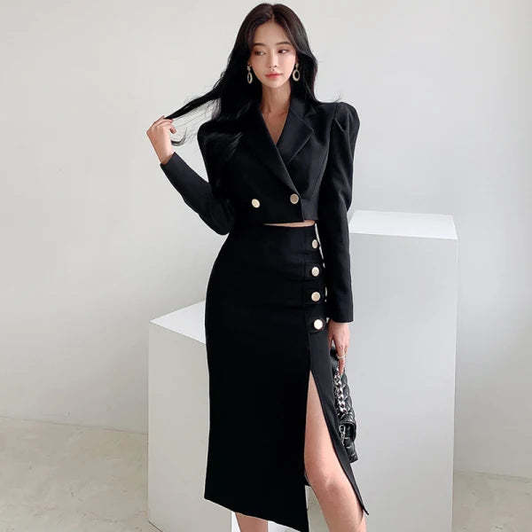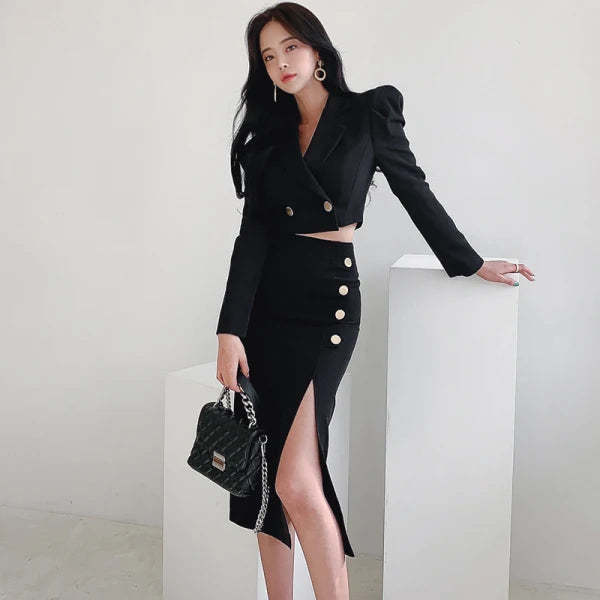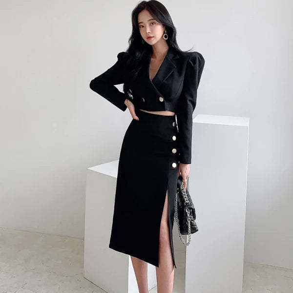 - Spring Autumn Puff Sleeve Notched Collar Double Breasted Tops + High Waist Split