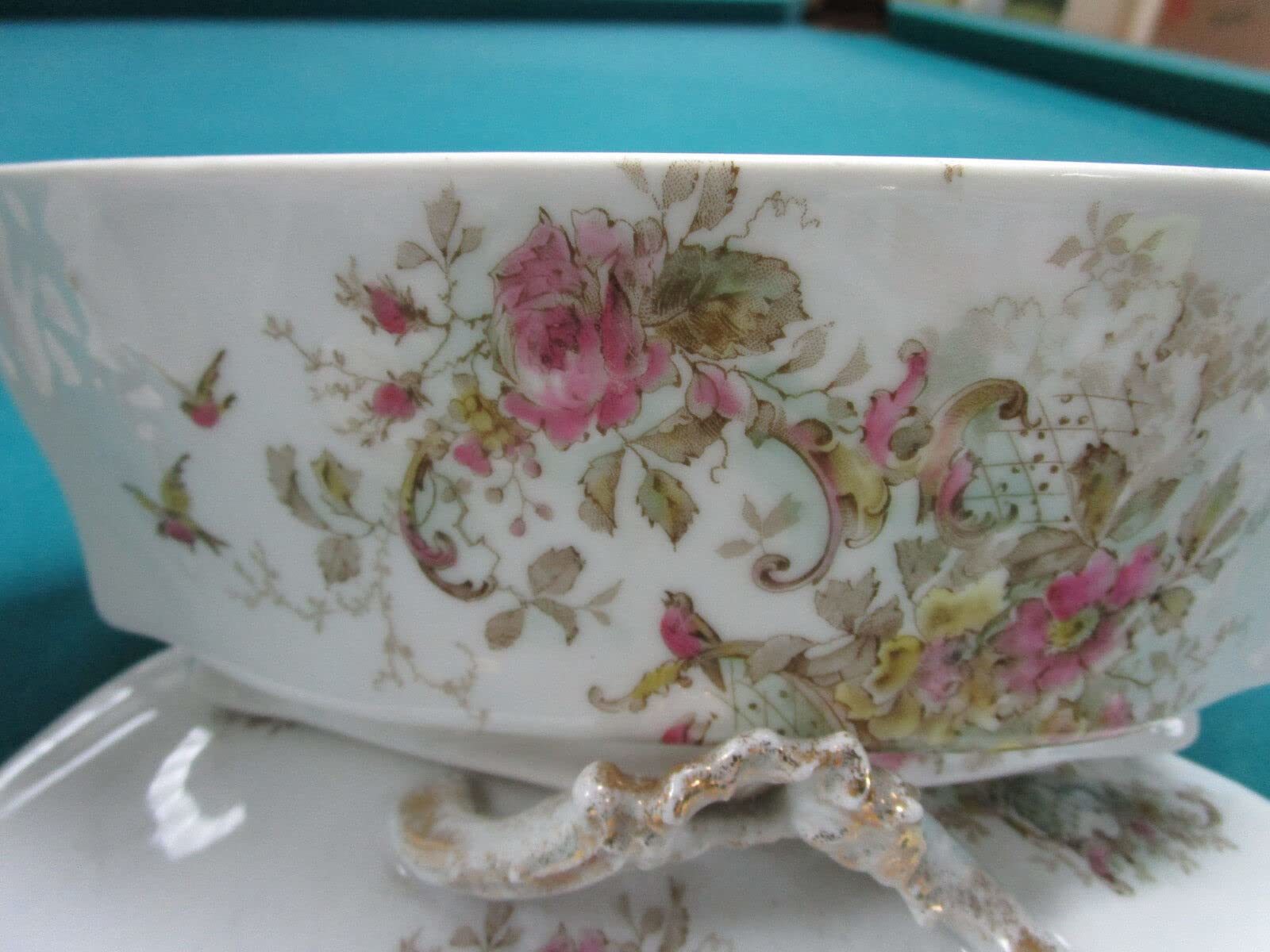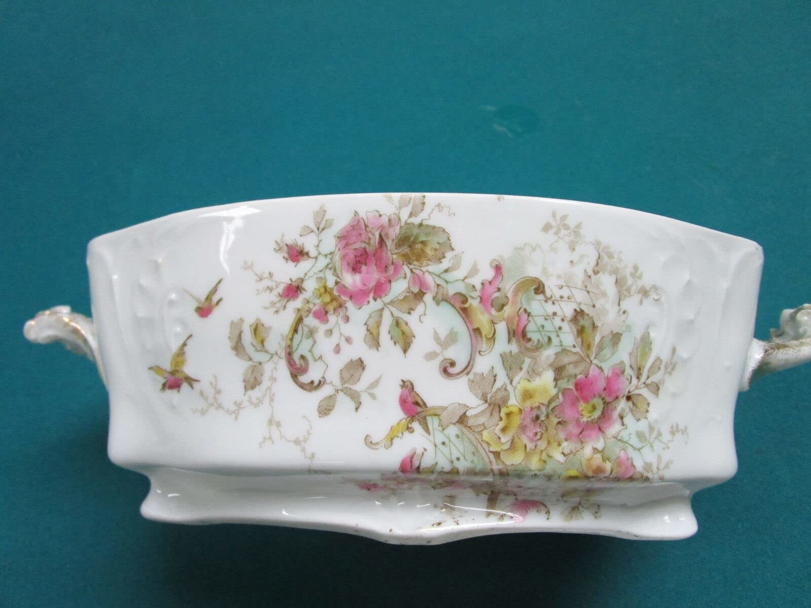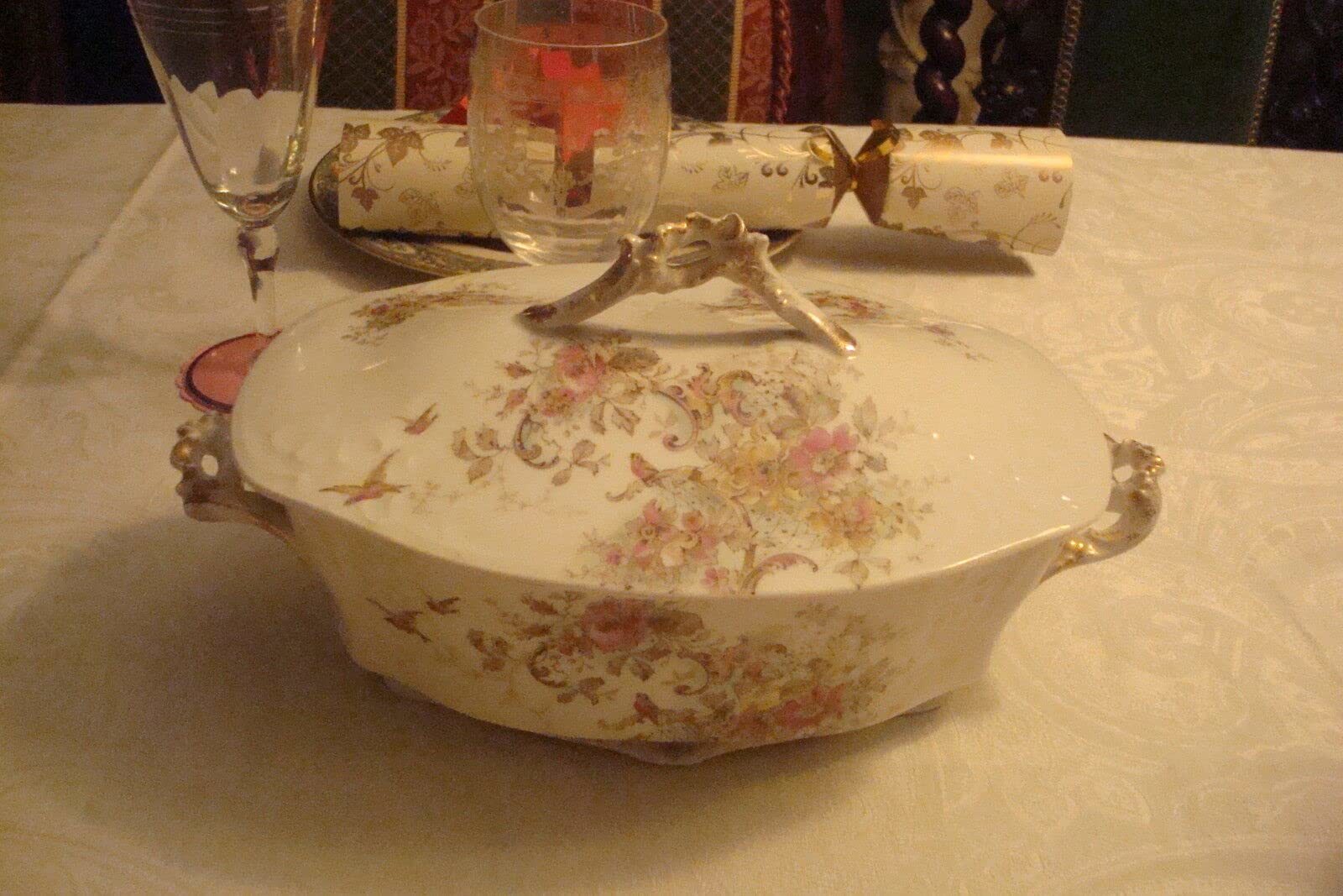 SPRINGER Co. [later EPIAG] GERMANY, Bohemia -ca 1890s - tureen molded decorated with flowers and gold, 6" tall by 12" by 7", very good condition, some light surface scratches and gold fading commensurate with age [POTT3BSKTRACK3]