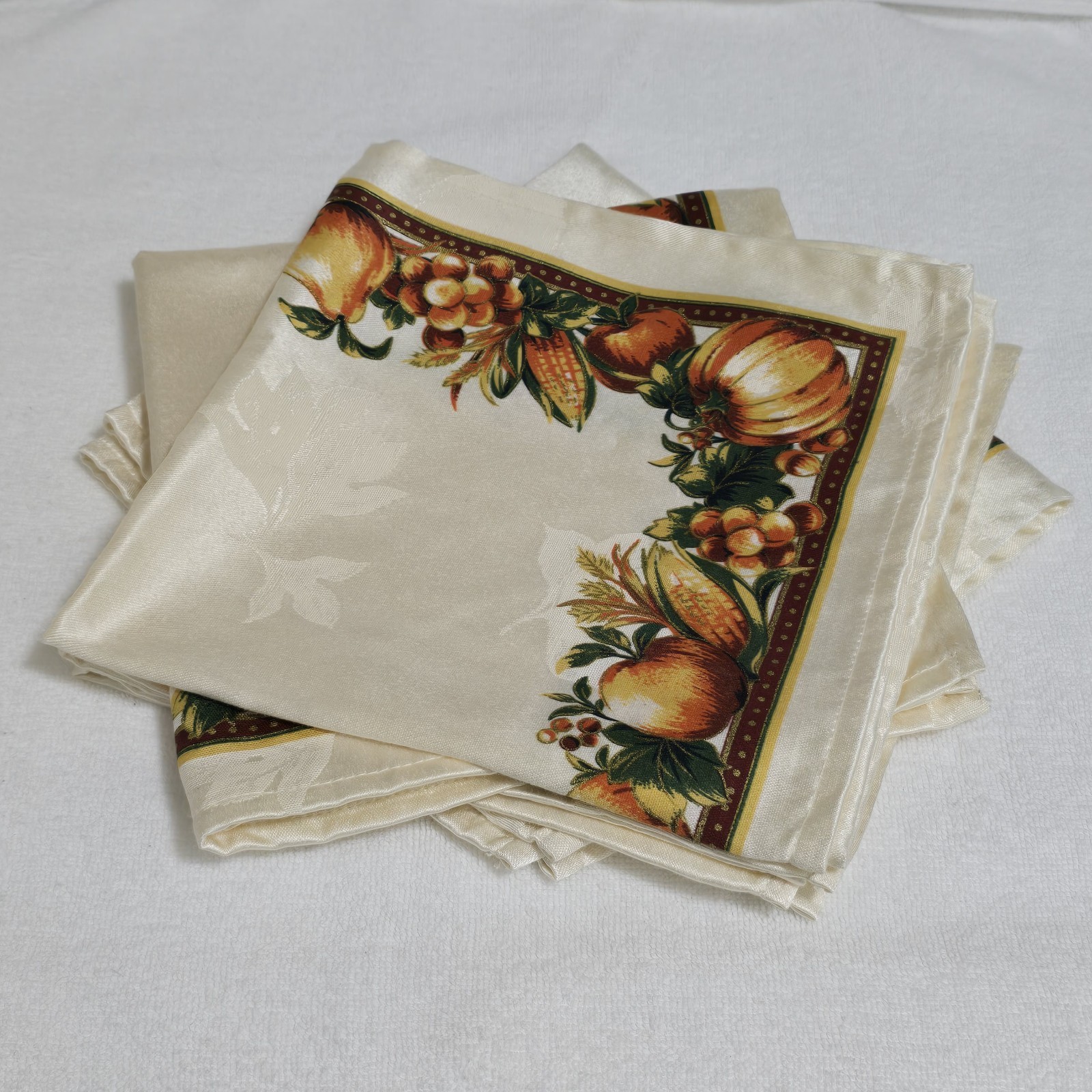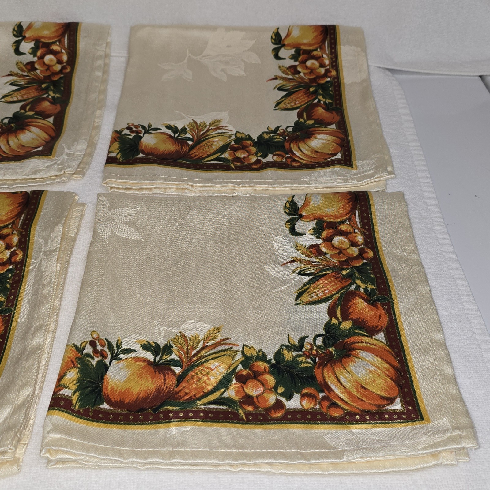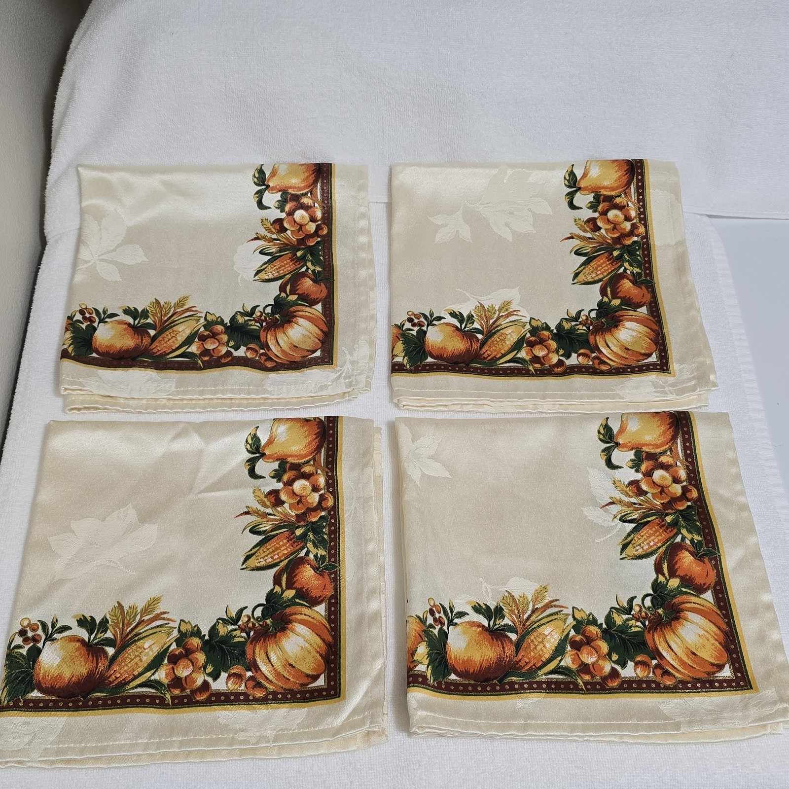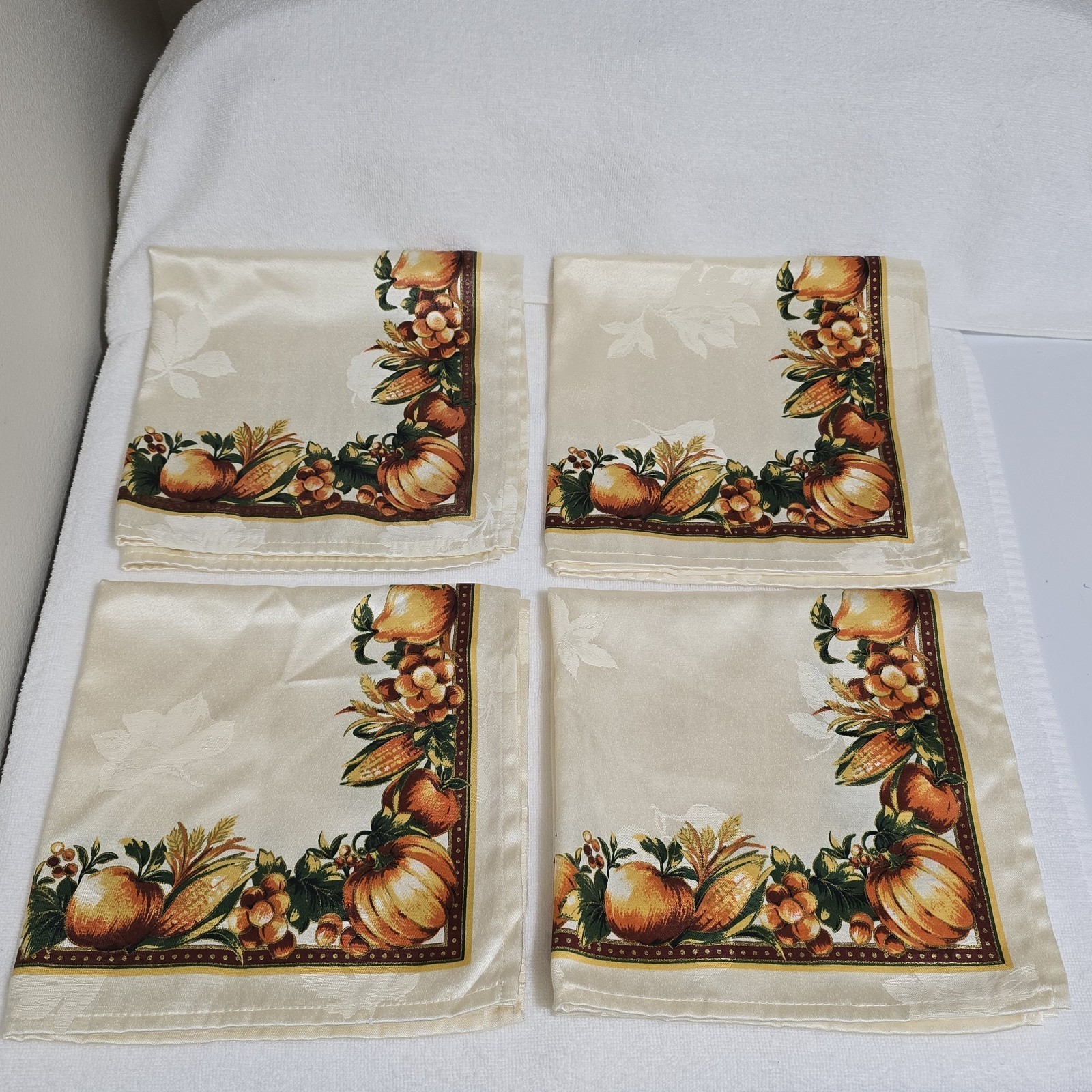 Beautiful set of 4 Autumn Square Cloth Dinner Napkins featuring pumpkins / corn / nuts / fruit along the border. They measure approximately 18 inches square. They have leave design woven into the ivory color cloth, and the edge is folded over and sewn. All are in excellent condition with no tears or stains found. There are no manufacturer tags on any of the napkins.