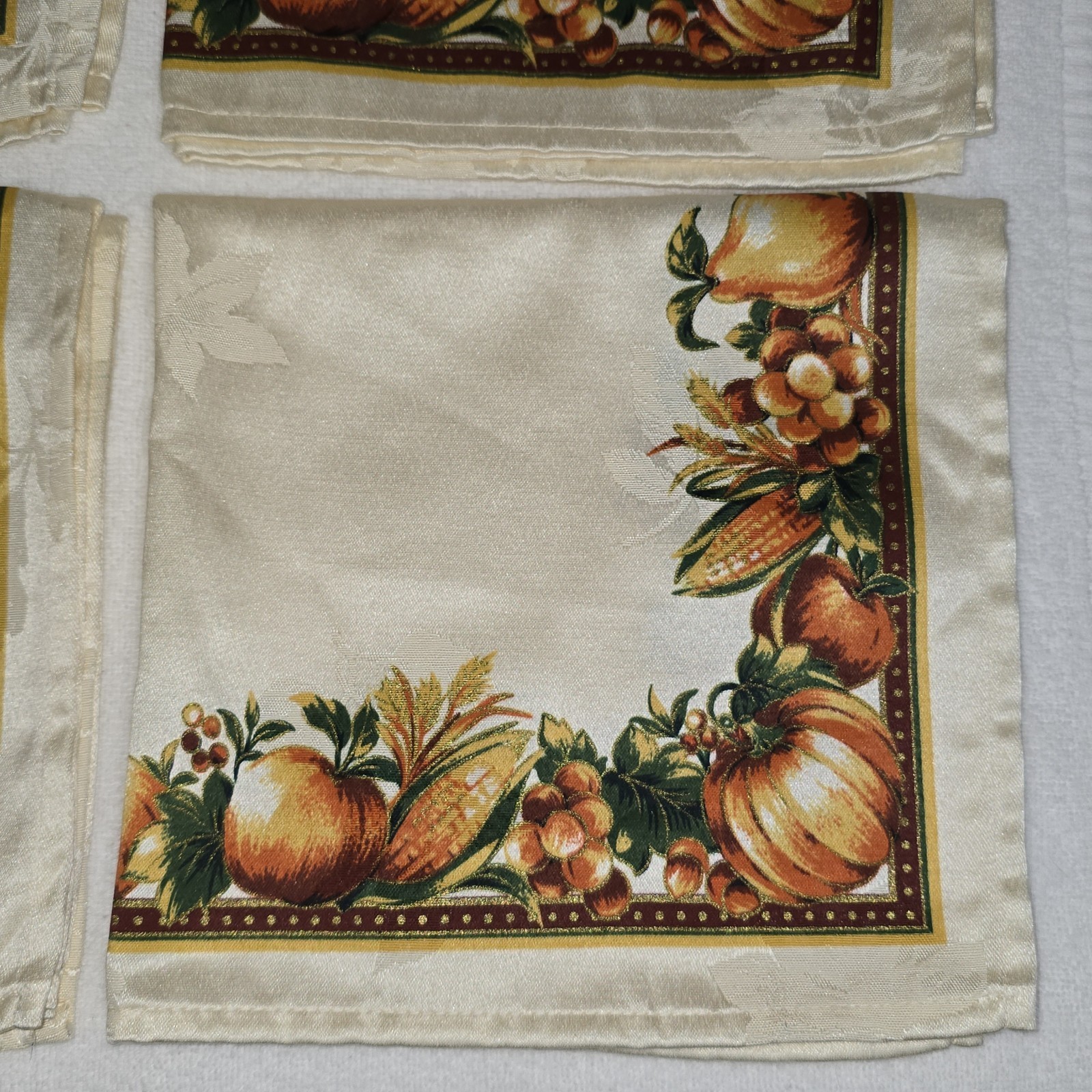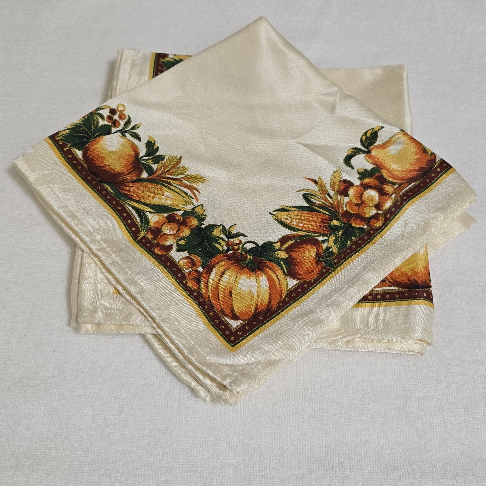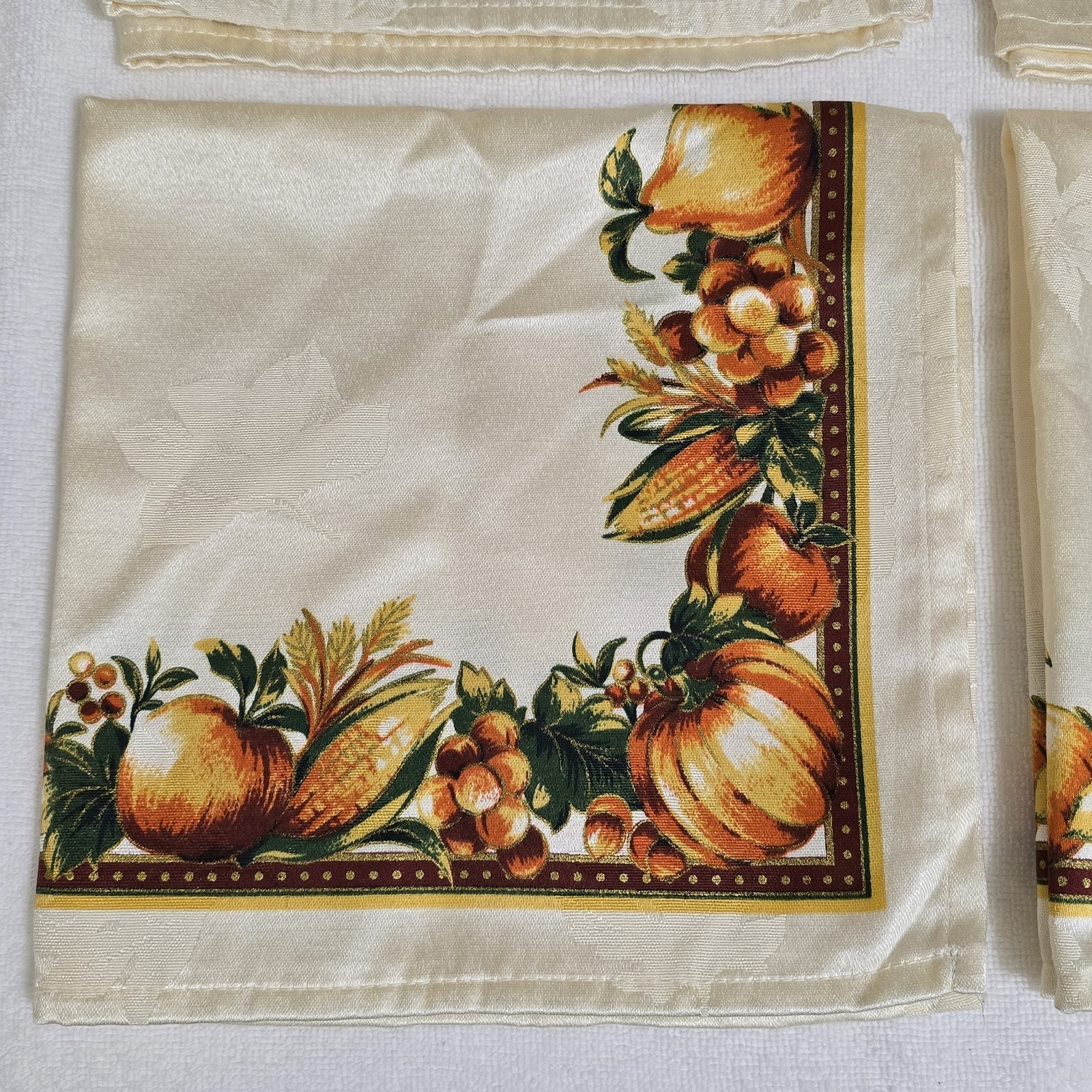 Beautiful set of 4 Autumn Square Cloth Dinner Napkins featuring pumpkins / corn / nuts / fruit along the border. They measure approximately 18 inches square. They have leave design woven into the ivory color cloth, and the edge is folded over and sewn. All are in excellent condition with no tears or stains found. There are no manufacturer tags on any of the napkins.