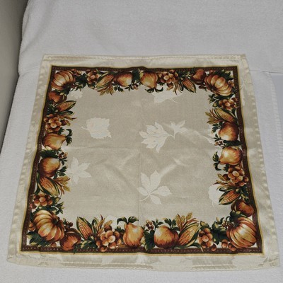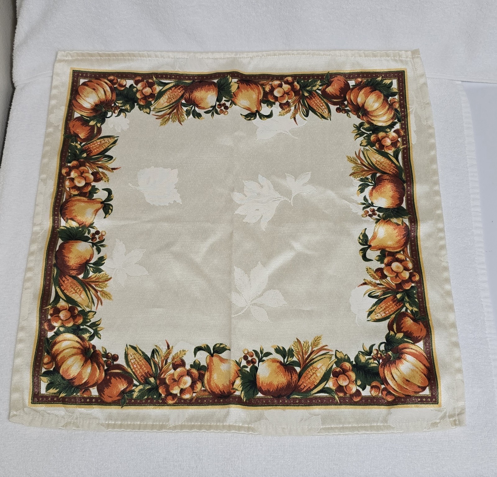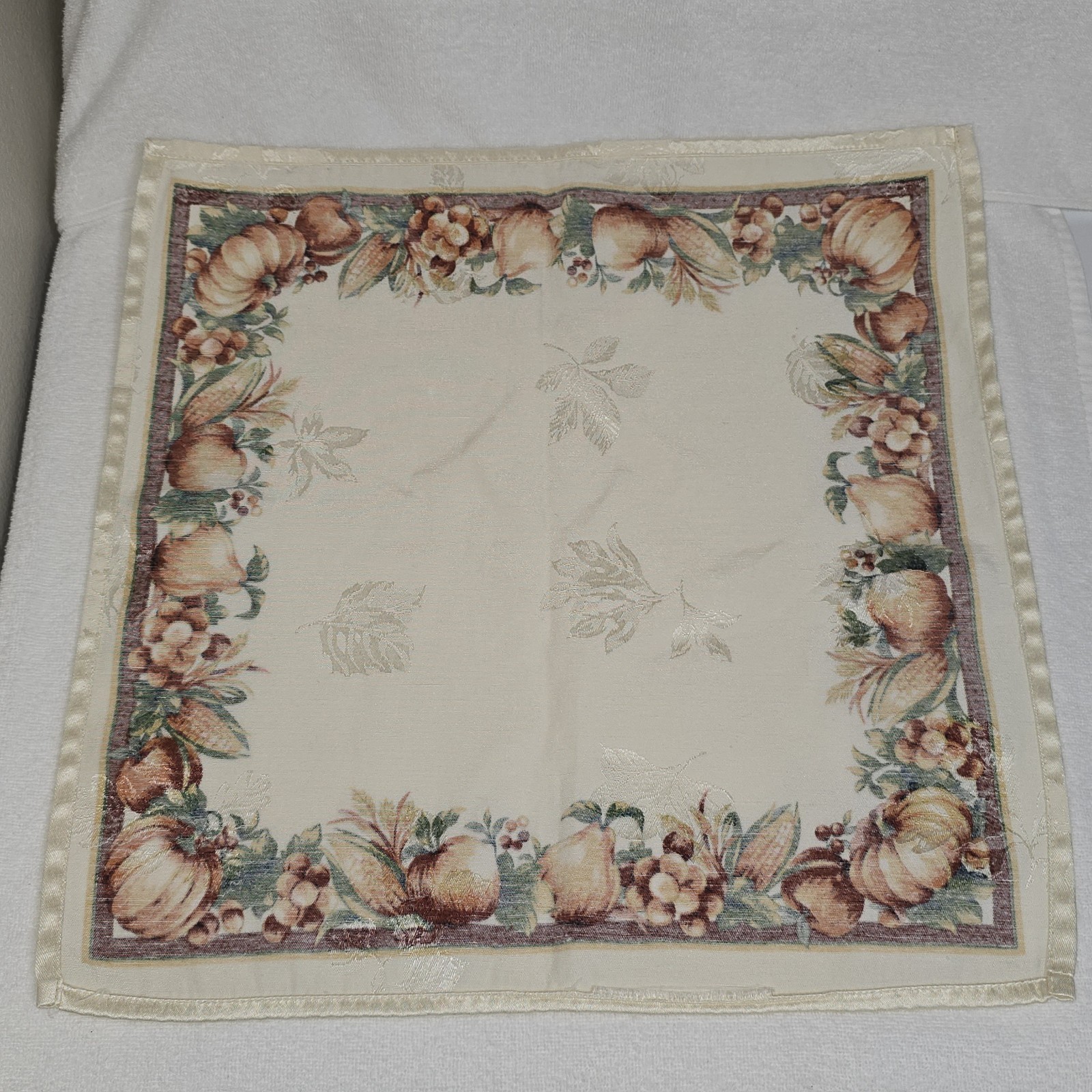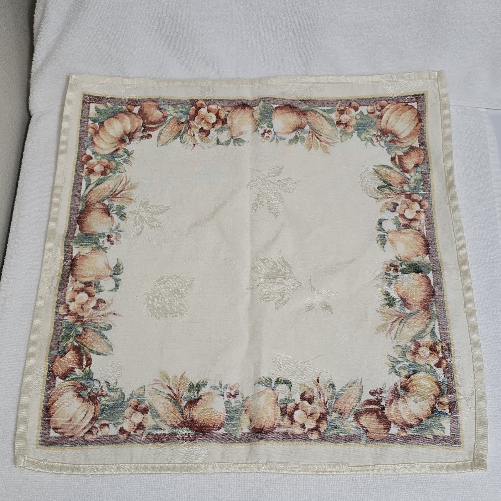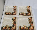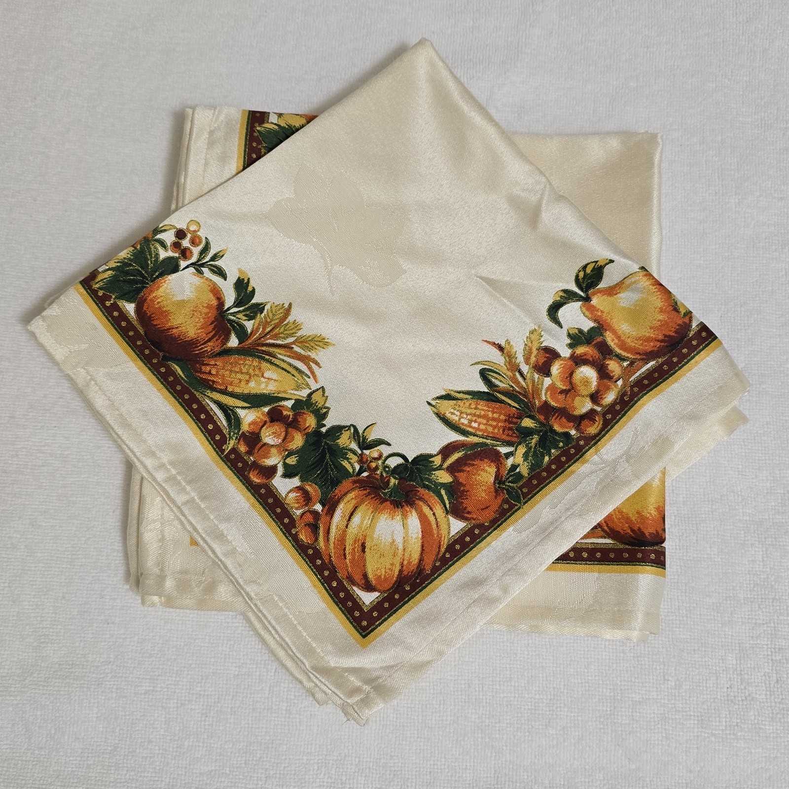 Beautiful set of 4 Autumn Square Cloth Dinner Napkins featuring pumpkins / corn / nuts / fruit along the border. They measure approximately 18 inches square. They have leave design woven into the ivory color cloth, and the edge is folded over and sewn. All are in excellent condition with no tears or stains found. There are no manufacturer tags on any of the napkins.