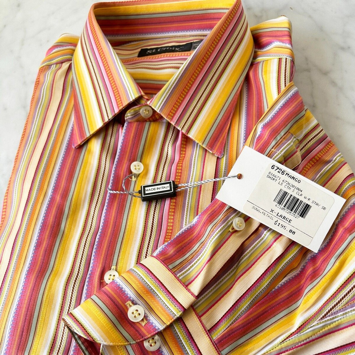 Elevate your wardrobe with this vibrant St Croix dress shirt in mango yellow and orange stripes. Made in Italy with premium quality cotton, this shirt offers a regular fit and features a collared neckline, long sleeves, and button closure. Perfect for casual and formal occasions alike, this button-up shirt is a must-have for any fashion-forward man's wardrobe. Machine washable for easy care, this shirt is a great addition to any collection. MSRP $195.00