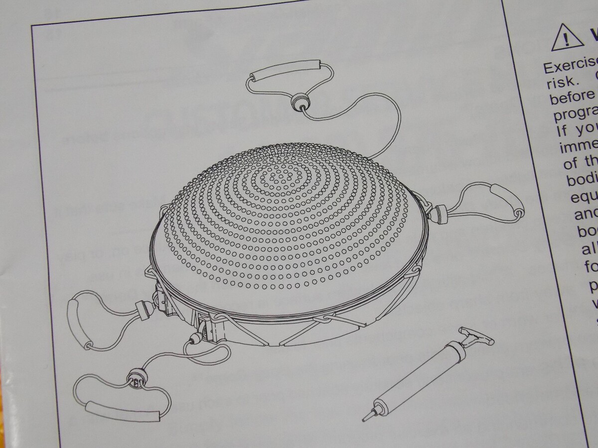 this is actually a really nice high quality inflatable dome type body balance trainer. it was bought new inflated and tried out for a few minutes but never really used like it should be, sadly its been in a closet for years now, its still perfect condition only one of the vhs tapes was opened. i think someone out there into fitness balance trainers would really like this device, it will be shipped with a label attached to the orig shipping box shown with minimal packing. thanks so much!!