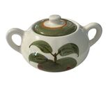 A vintage Stangl Pottery covered sugar bowl from the ?Orchard Song? pattern, featuring hand-painted green leaves and warm earth-tone accents. A charming addition to a Stangl collection or a cozy vintage kitchen display.