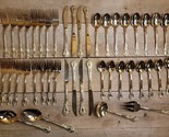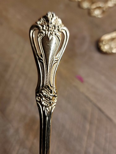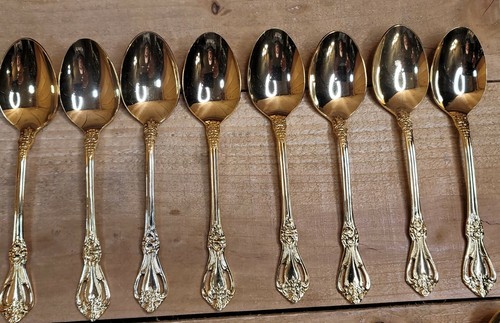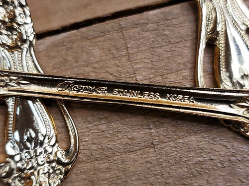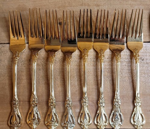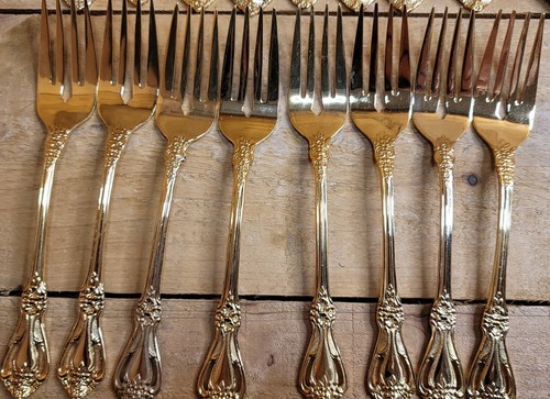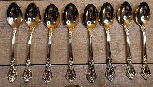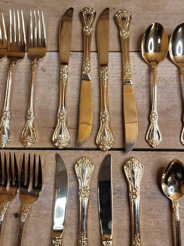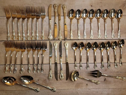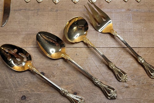 - Stanley Roberts Gold Valentine Electroplate Floral Pierced Flatware 44 pc Set