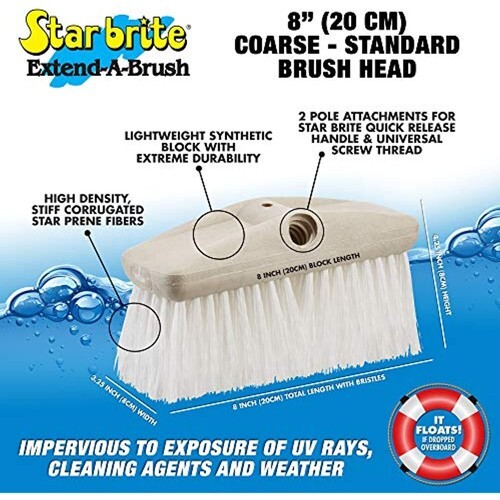 Star brite Extend-A-Brush heads are made with Star prene, a lightweight polymer fiber that does not stain, discolor or become brittle. It resists most cleaning chemicals and withstands heat up to 200F. The bristle material will not rot, mildew or absorb odors.