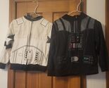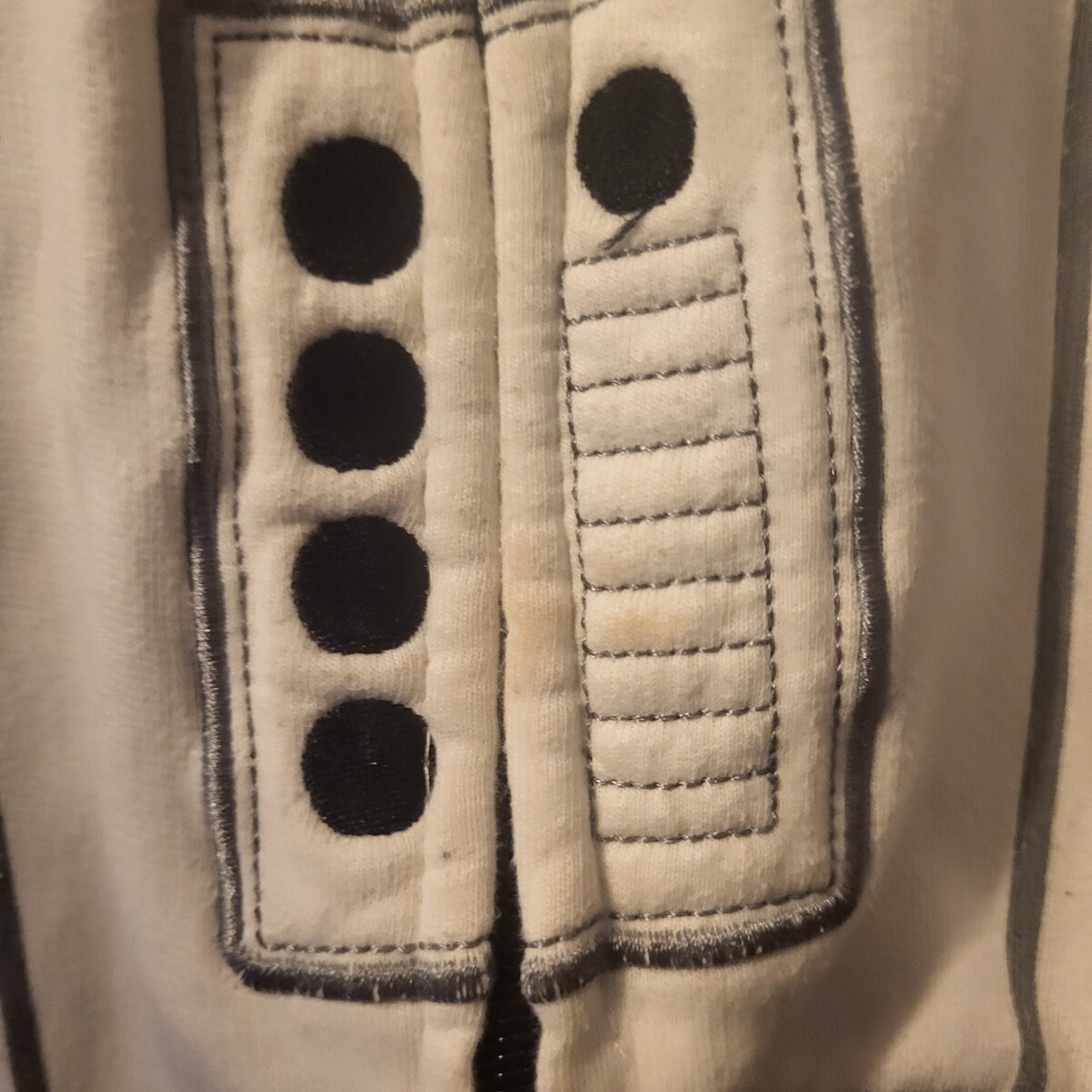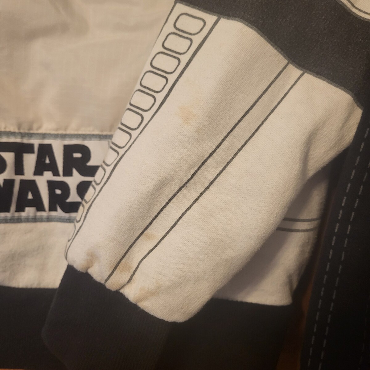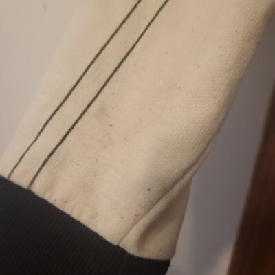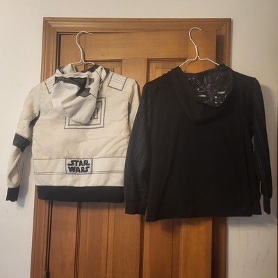 This is for 2 zip up sweatshirts. The black one is in great condition and comes with a cape on the back. The white one is in good condition but does have some stains as pictured so im just including it with the black one.