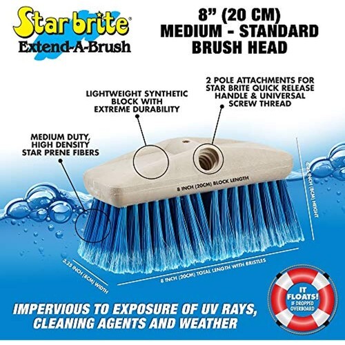 Star brite Extend-A-Brush heads are made with star prene, a lightweight polymer fiber that does not stain, discolor or become brittle. It resists most cleaning chemicals and withstands heat up to 200F. This space-age material will not Rot, mildew or absorb odors. Star brite poles are constructed with Aircraft grade, triple anodized aluminum for years of maintenance-free use.