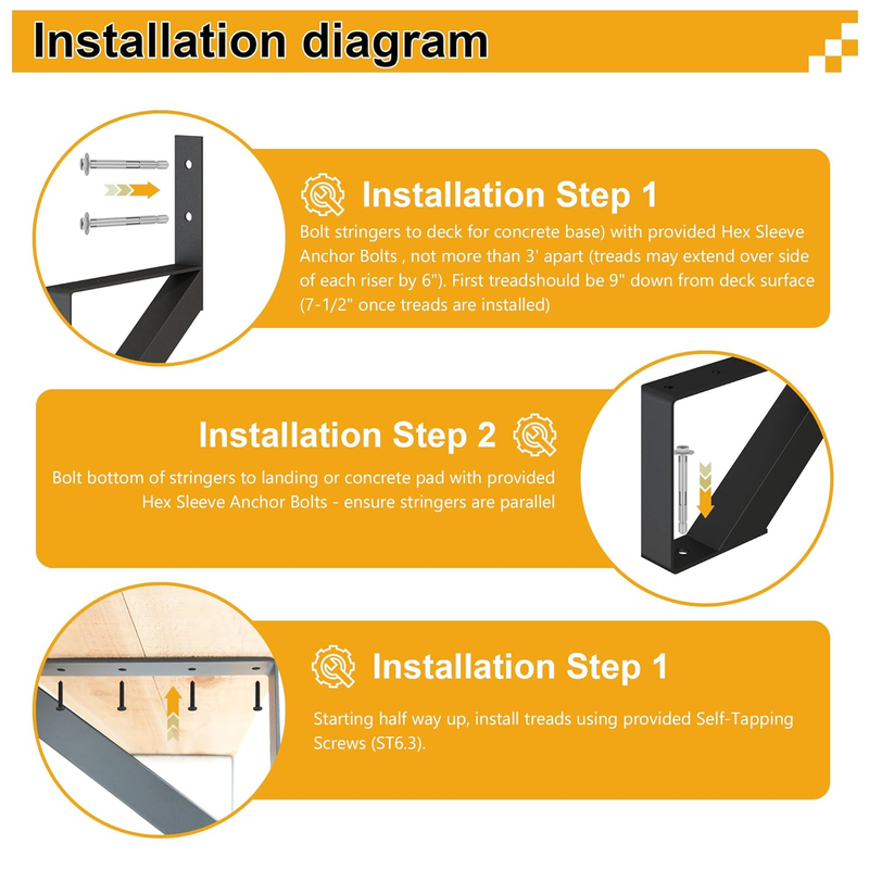 Easy to Install: Designed for hassle-free setup, the deck stringer comes with pre-drilled holes. For proper installation, keep the spacing between two stringers no greater than 3 feet, and ensure the first tread is positioned 9 inches below the deck surface.