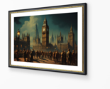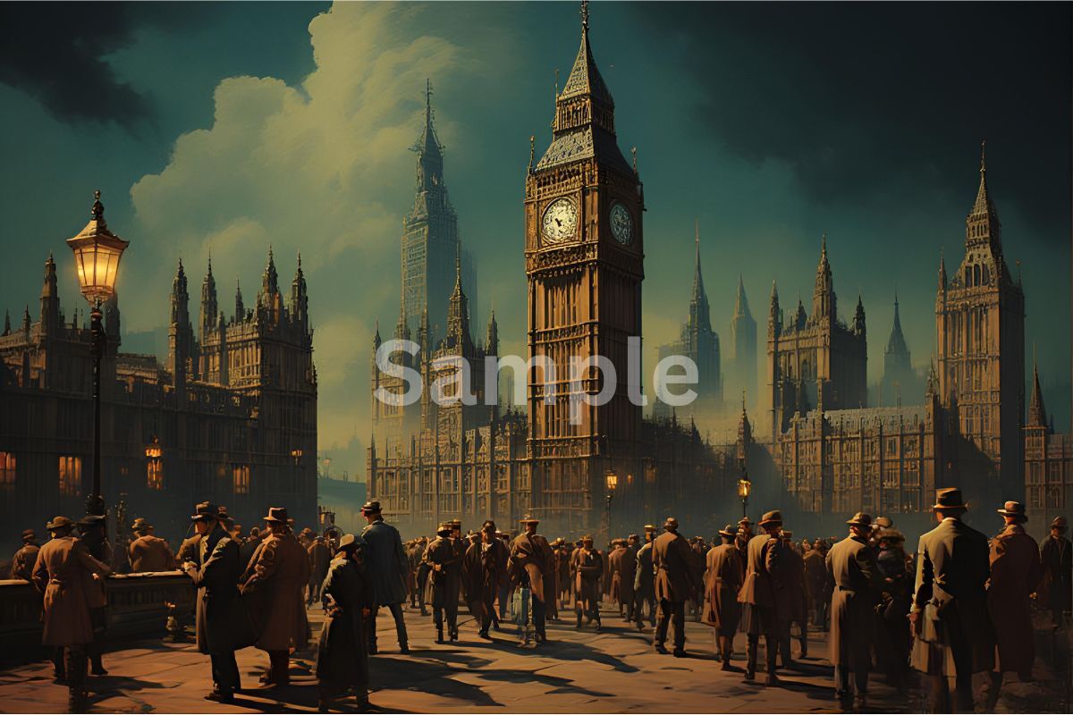 Step into a strikingly atmospheric vision of London—where history, mystery, and cinematic style converge. This artwork captures the timeless silhouette of the iconic clock tower rising above a sea of warm golden light, while crowds dressed in vintage coats and fedoras move through the scene like characters from a classic detective film. The sky is dramatic, painted with towering clouds that evoke both grandeur and suspense. Every architectural detail glows with depth and elegance, transforming the familiar London setting into a dreamlike world suspended between past and future. Perfect for collectors, storytellers, or lovers of neo-noir aesthetics, this piece adds sophistication, intrigue, and a touch of cinematic magic to any space.