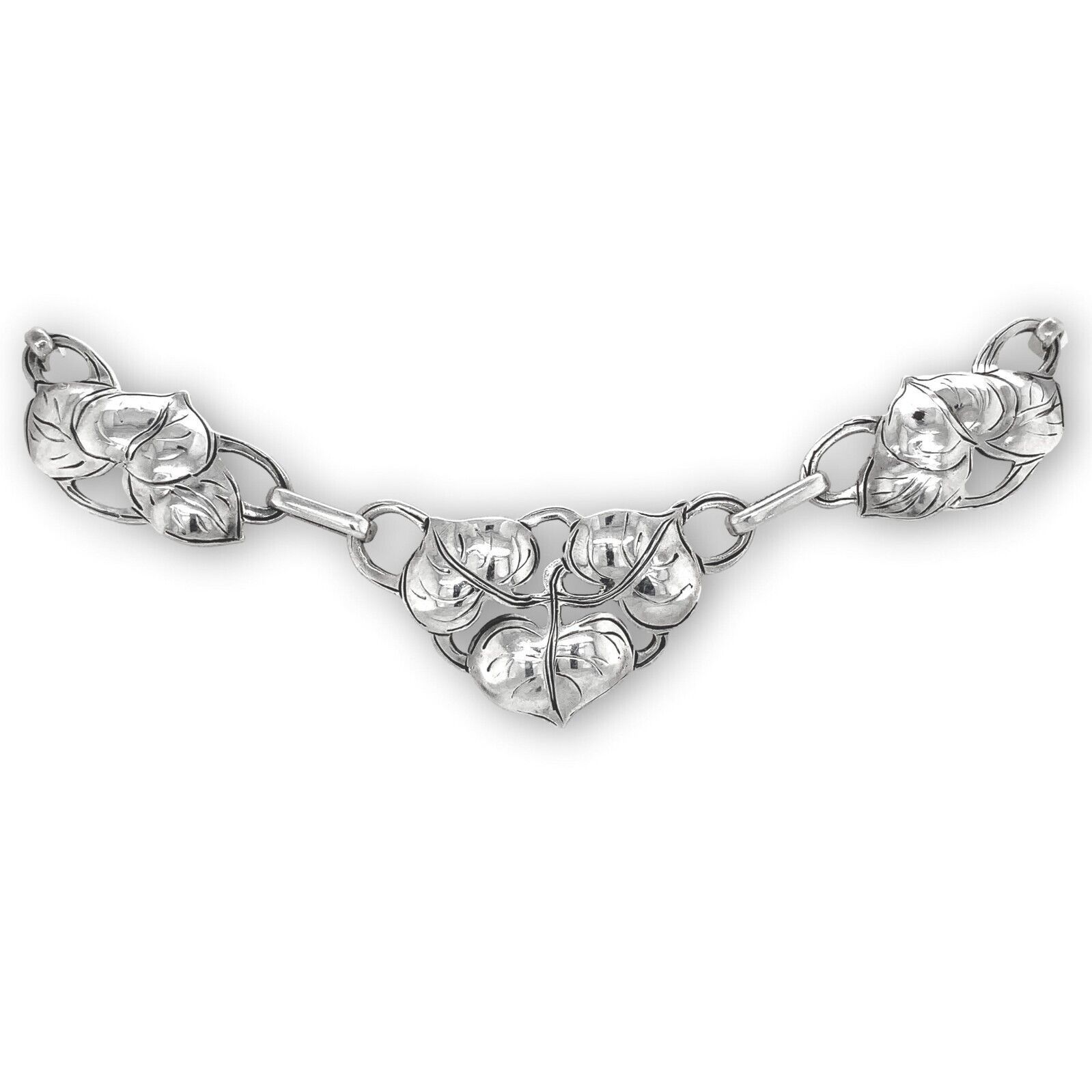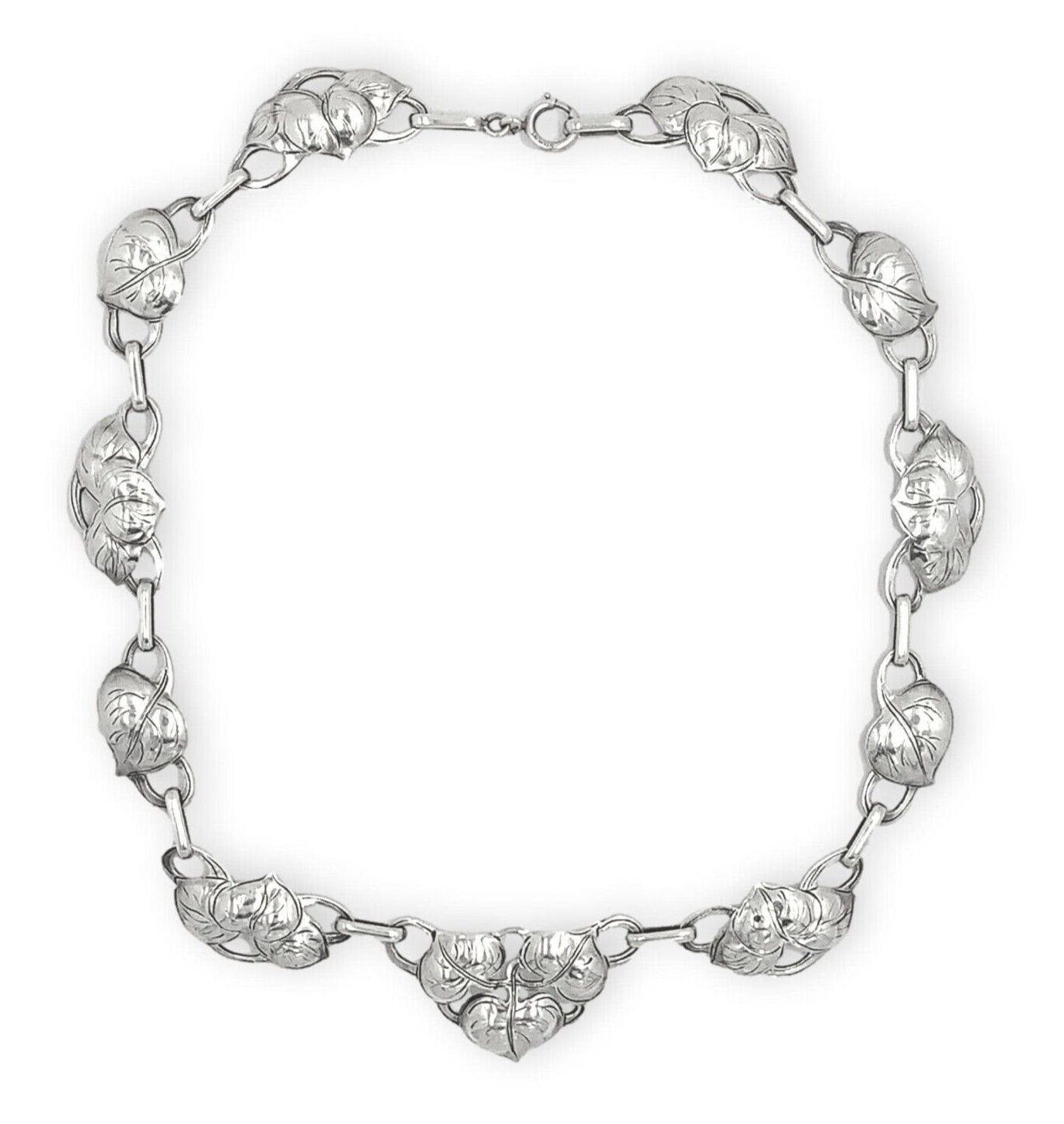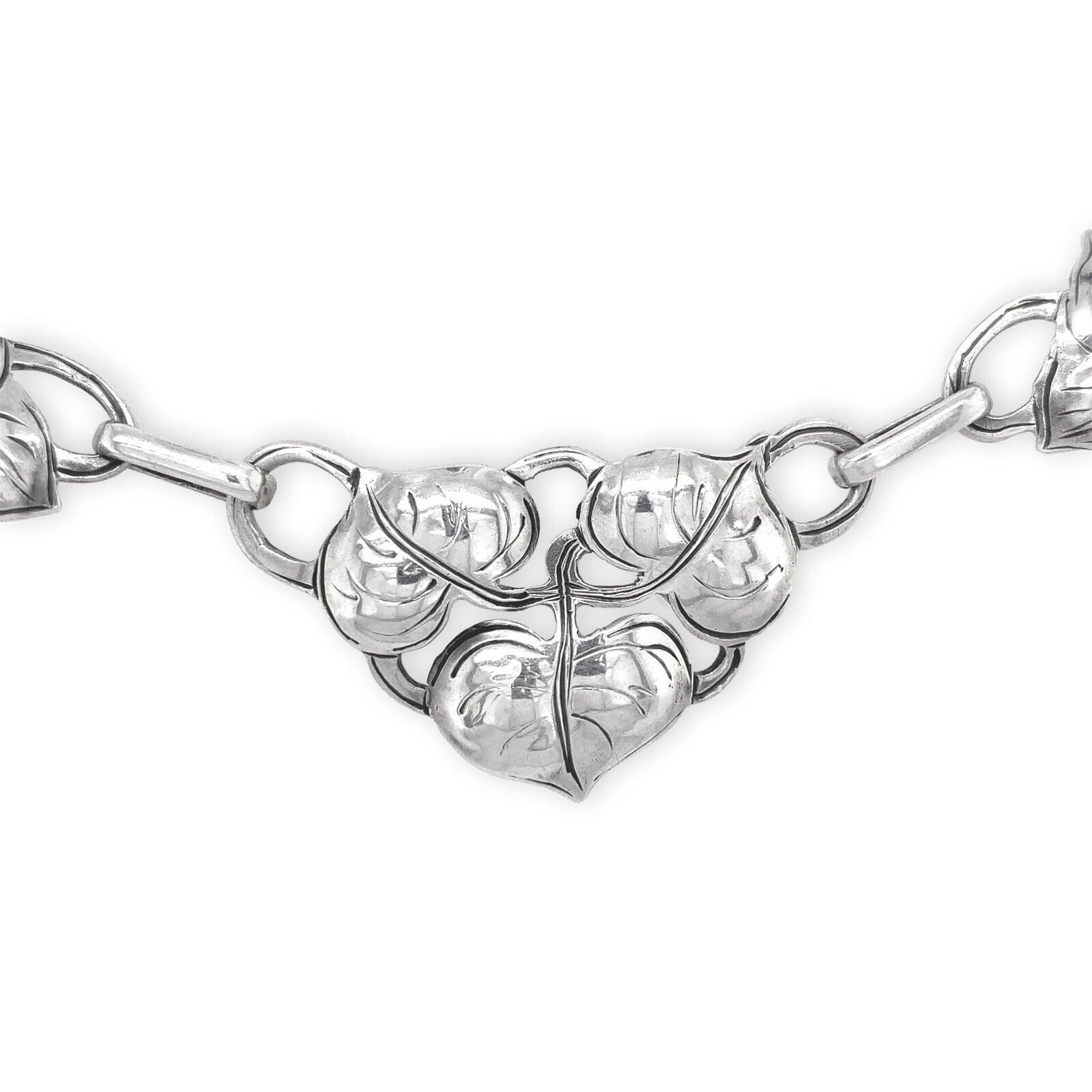 Sterling handwrought necklace made by Bjarne Axness, employee at the Kalo silver shop in Illinois. Marked: Sterling Hand Wrought. The necklace features pierced and engraved leaves with a three leaf center. The necklace measures 16 3/4" long and weighs 22.43 dwt. Circa 1909-1940s. Purchased from Bjarne's grandson. Wow!