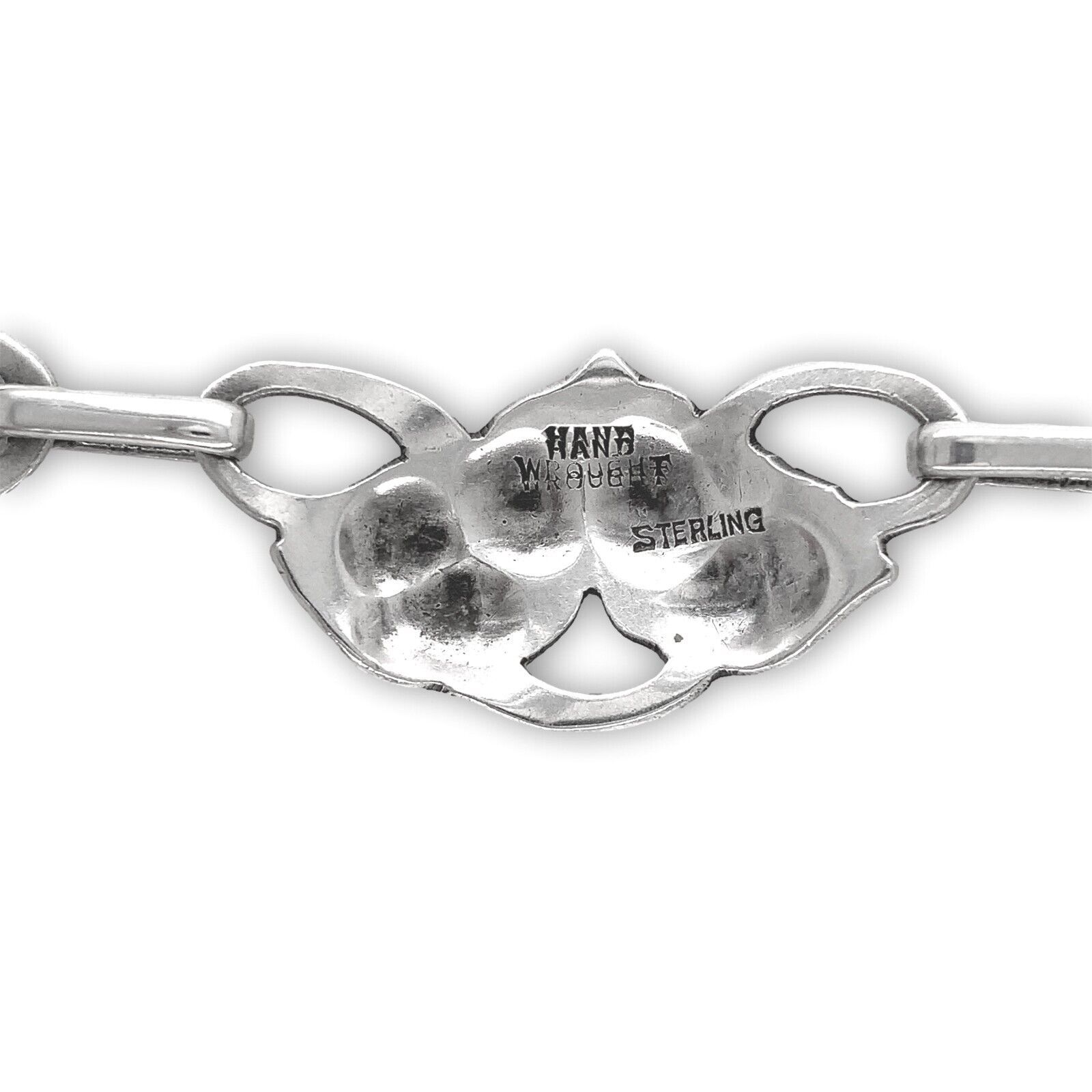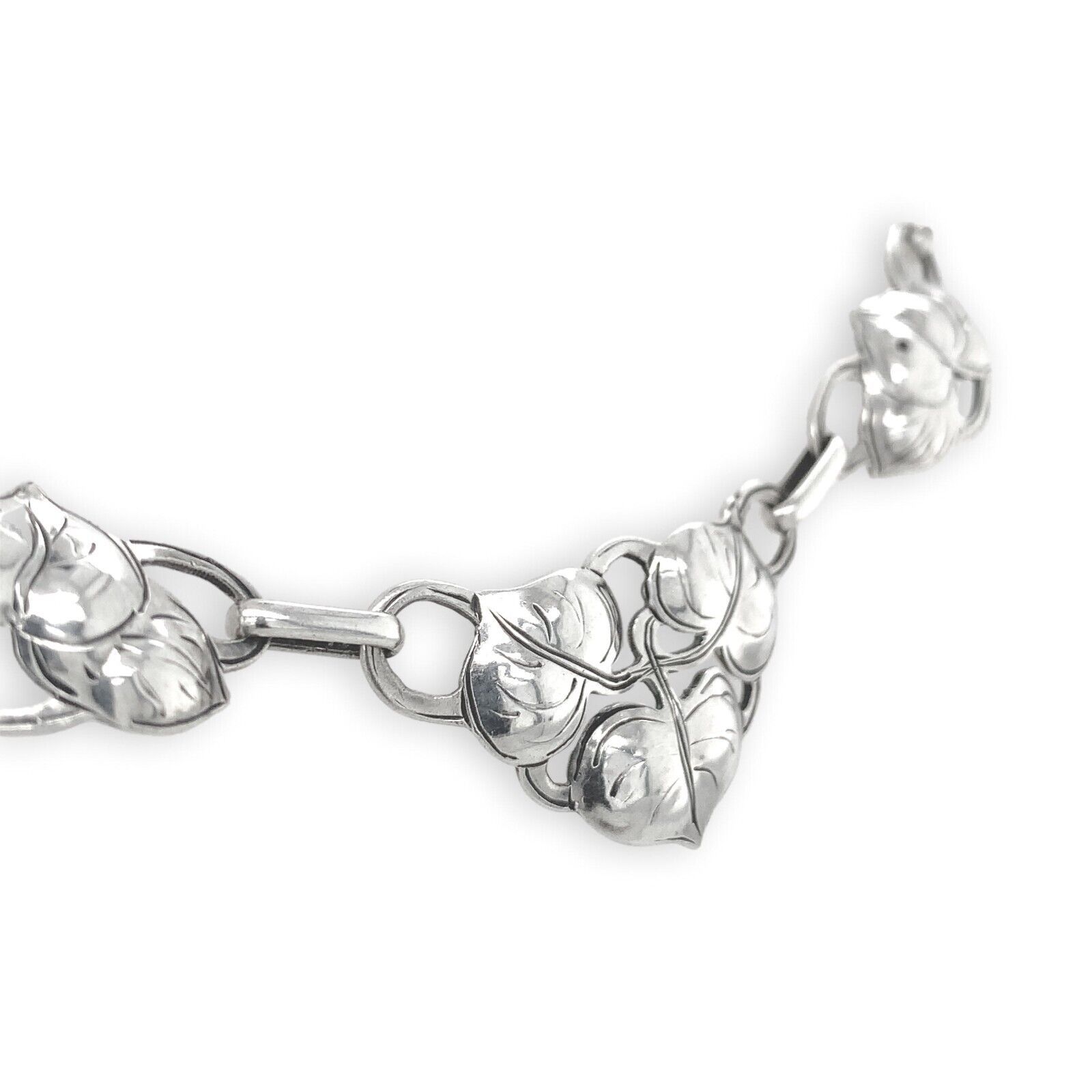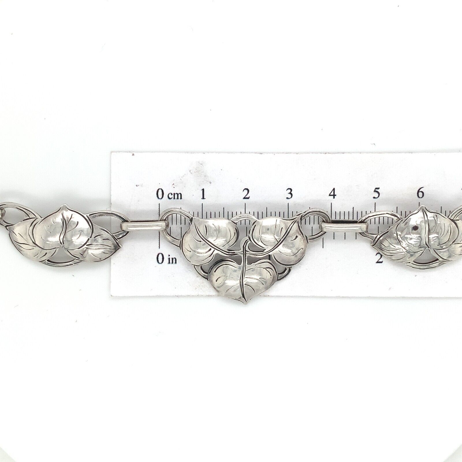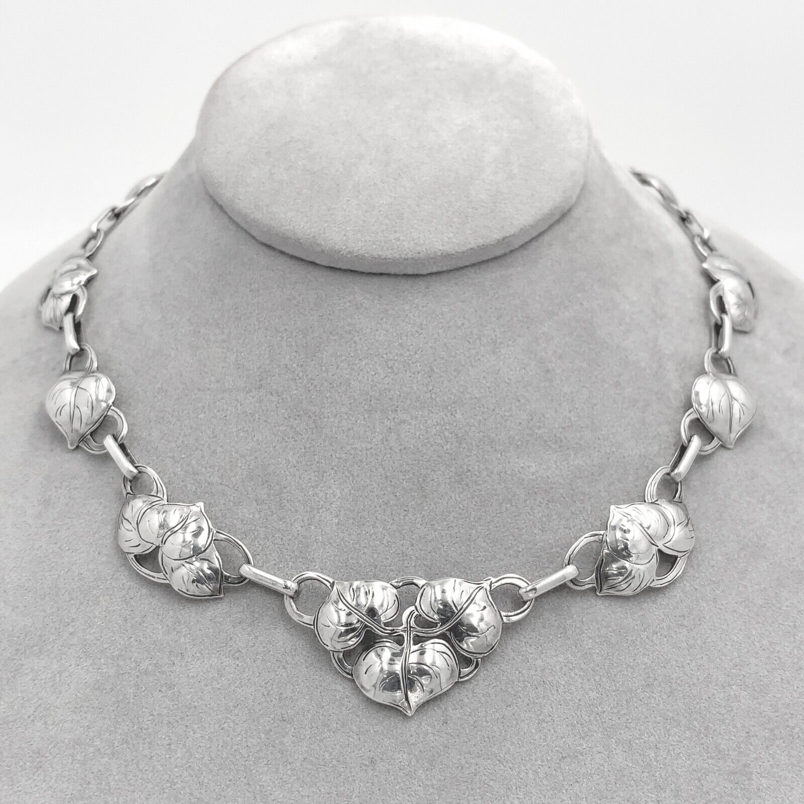 Sterling handwrought necklace made by Bjarne Axness, employee at the Kalo silver shop in Illinois. Marked: Sterling Hand Wrought. The necklace features pierced and engraved leaves with a three leaf center. The necklace measures 16 3/4" long and weighs 22.43 dwt. Circa 1909-1940s. Purchased from Bjarne's grandson. Wow!