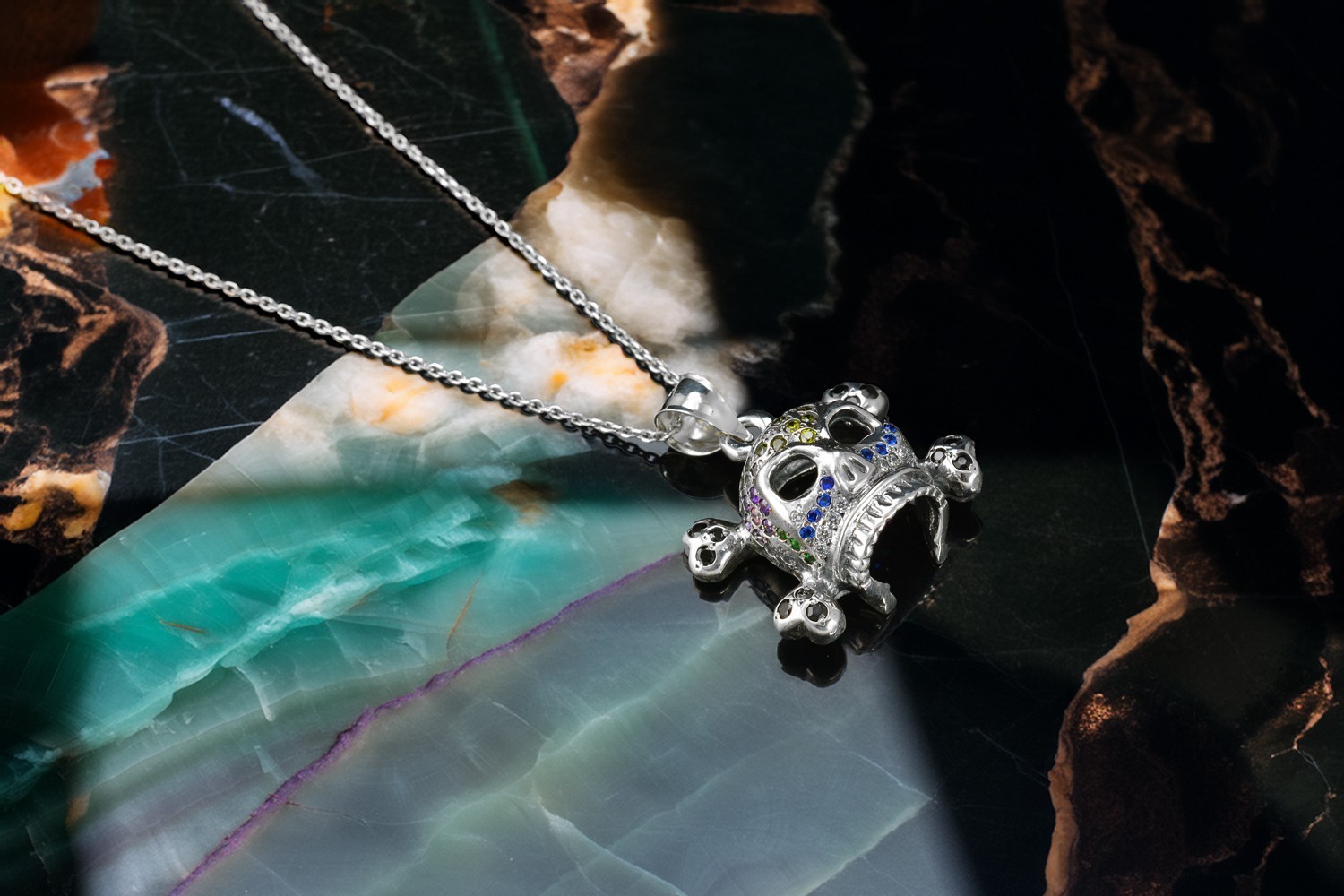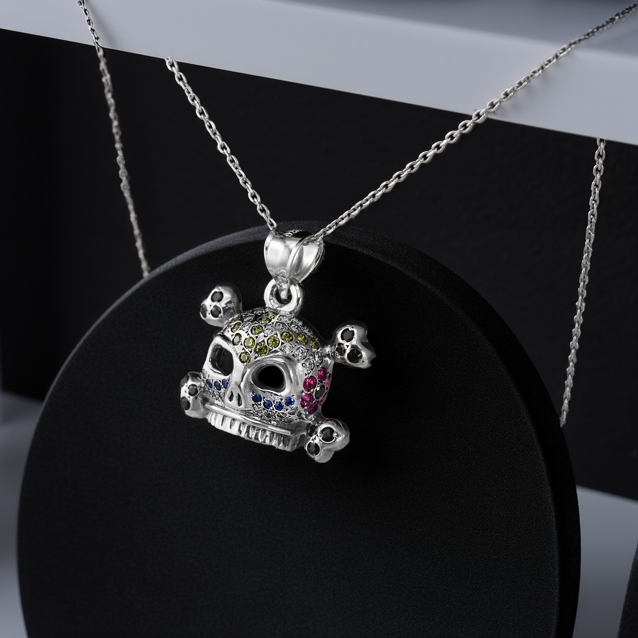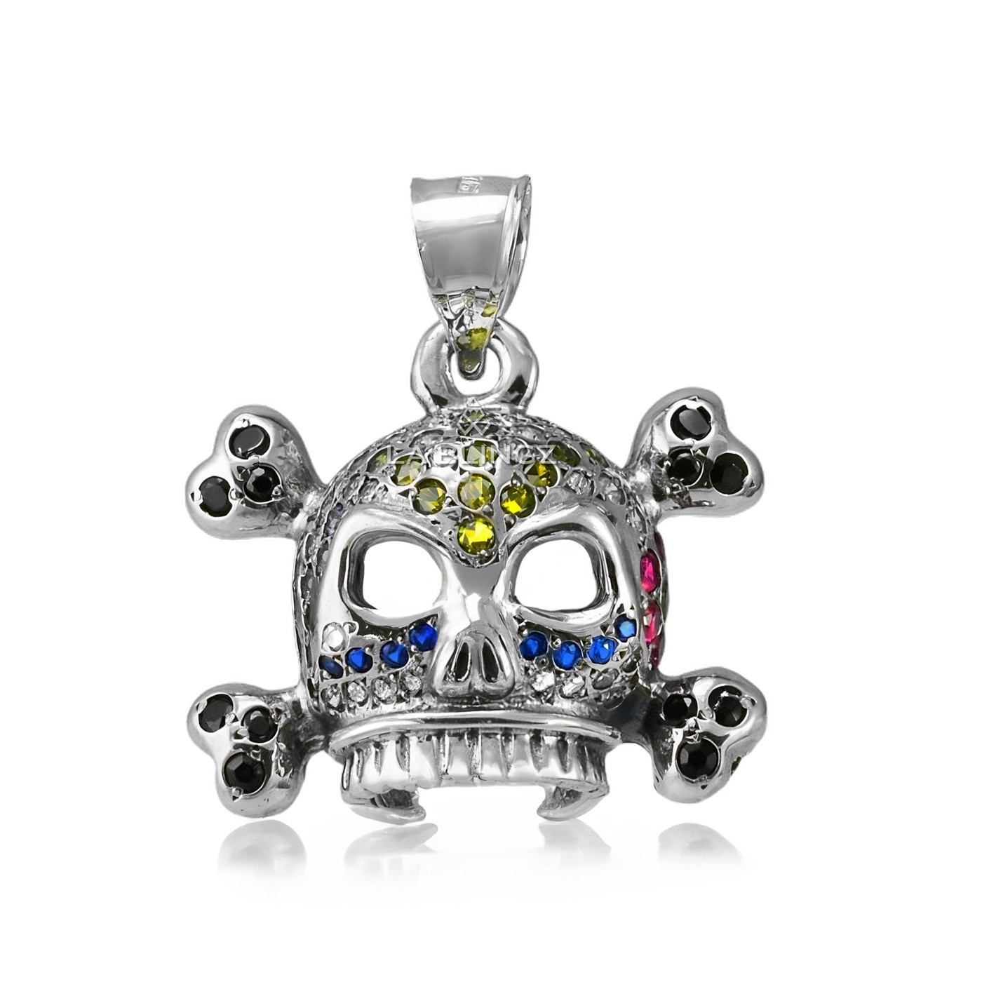 - Sterling Silver 3D Skull and Bones Color CZ Pendant Gothic Sugar Skull Necklace