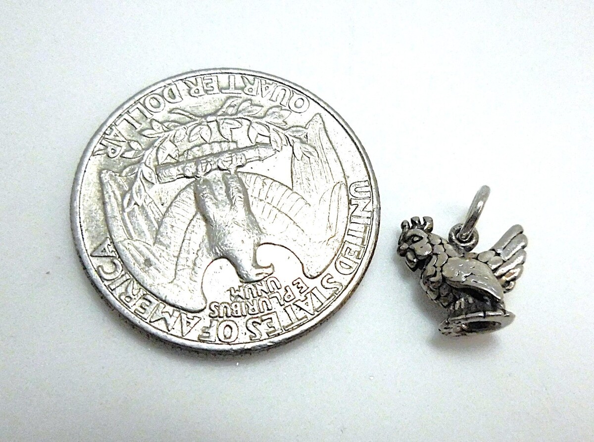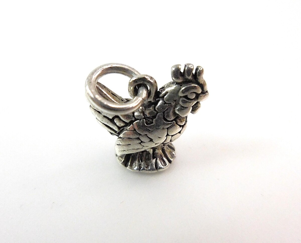 This is a small hen chicken. Use as a pendant or charm, it's stamped .925 on its base and has a maker's mark that is difficult to make out along with a copyright symbol. Very nicely detailed and in good pre-owned condition with an a purposely antiqued look that gives it depth. I have many charms to list so view the photos closely for condition and size. Otherwise ask any needed questions.