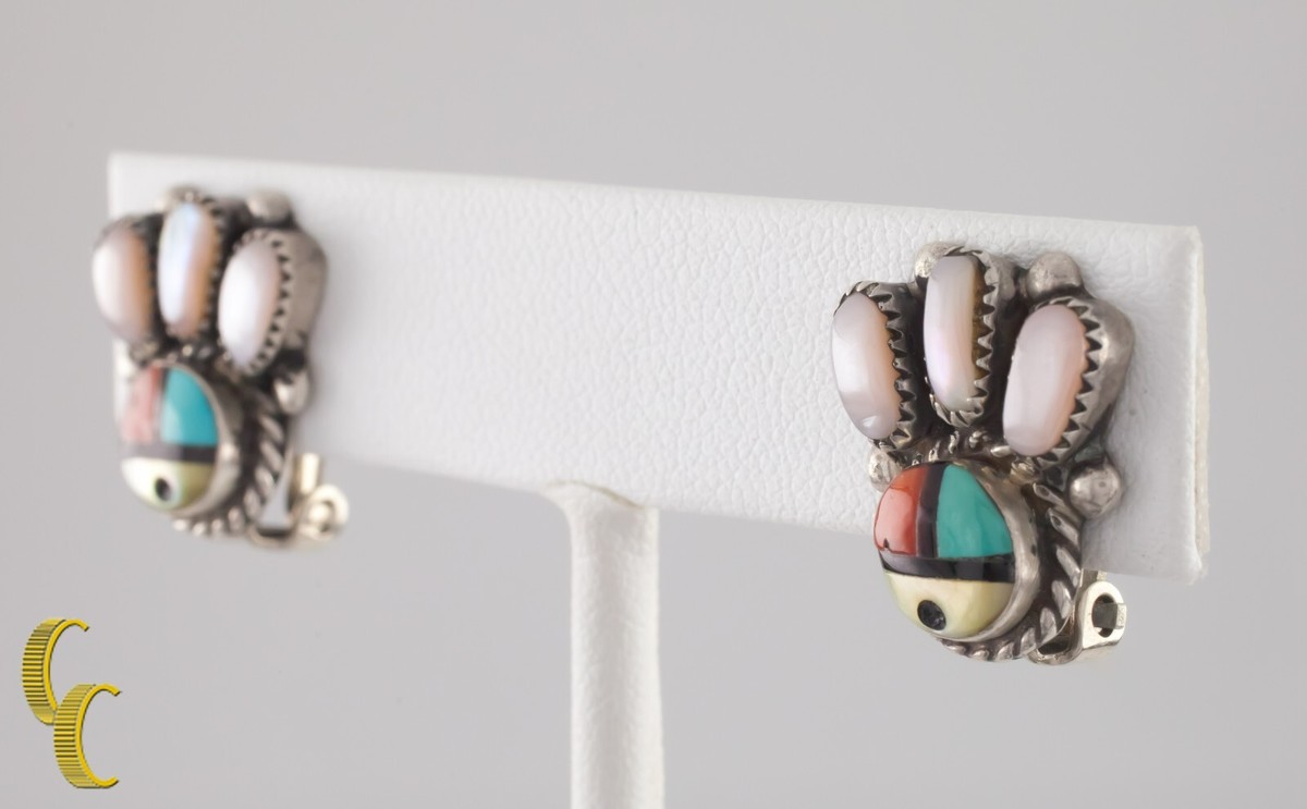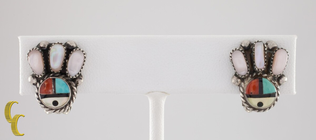 - Sterling Silver Lapidary Inlay Bear Paw Clip-On Earrings Zuni