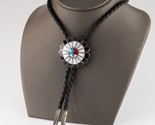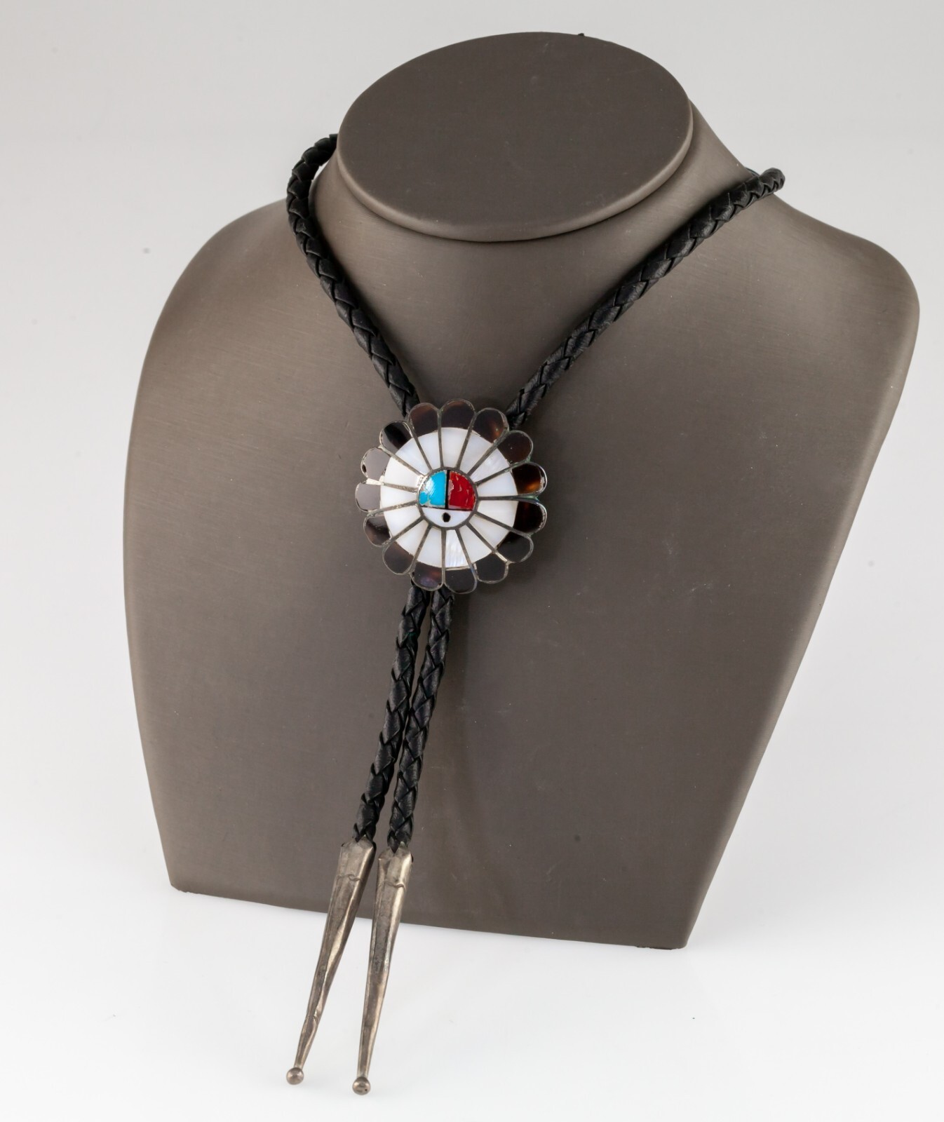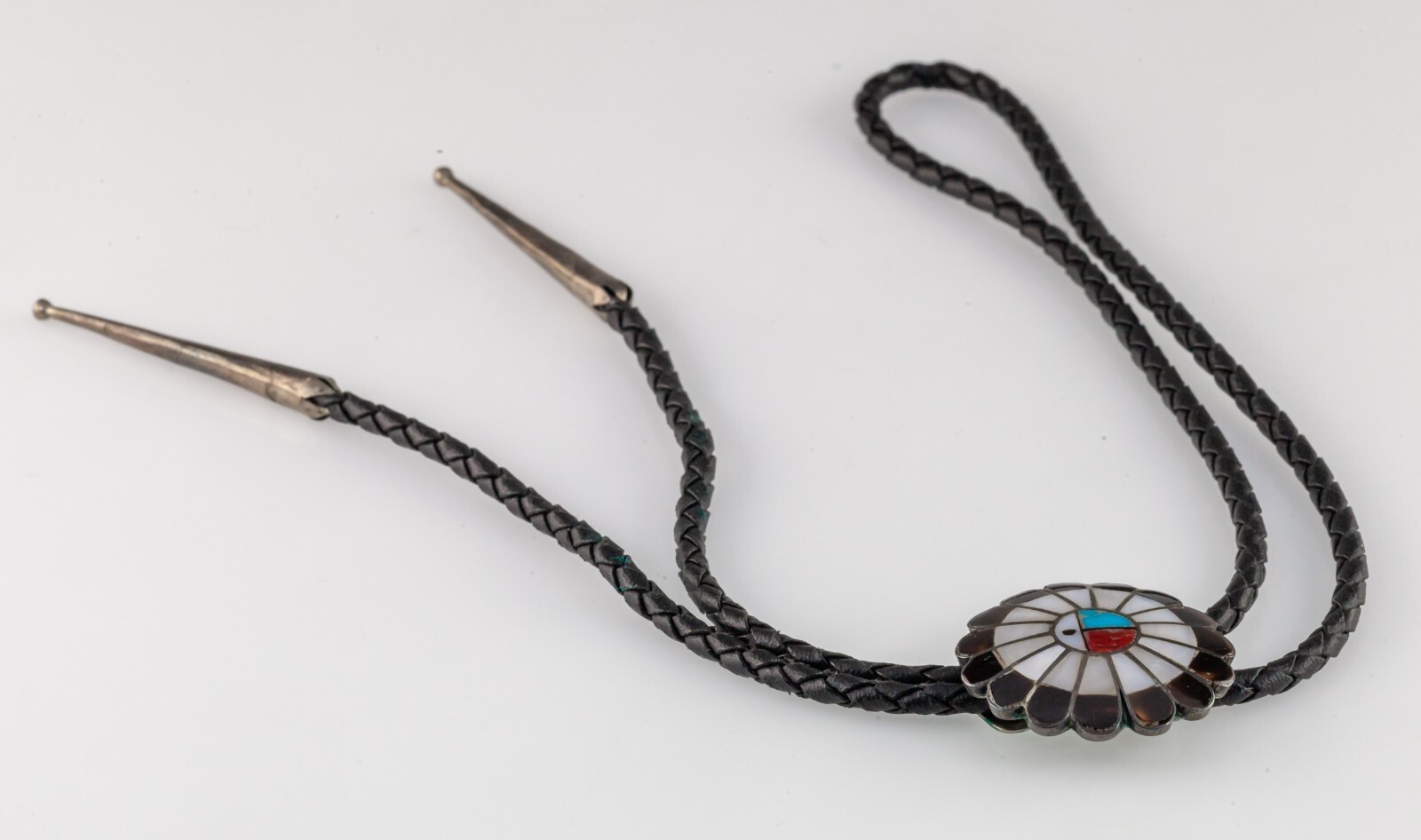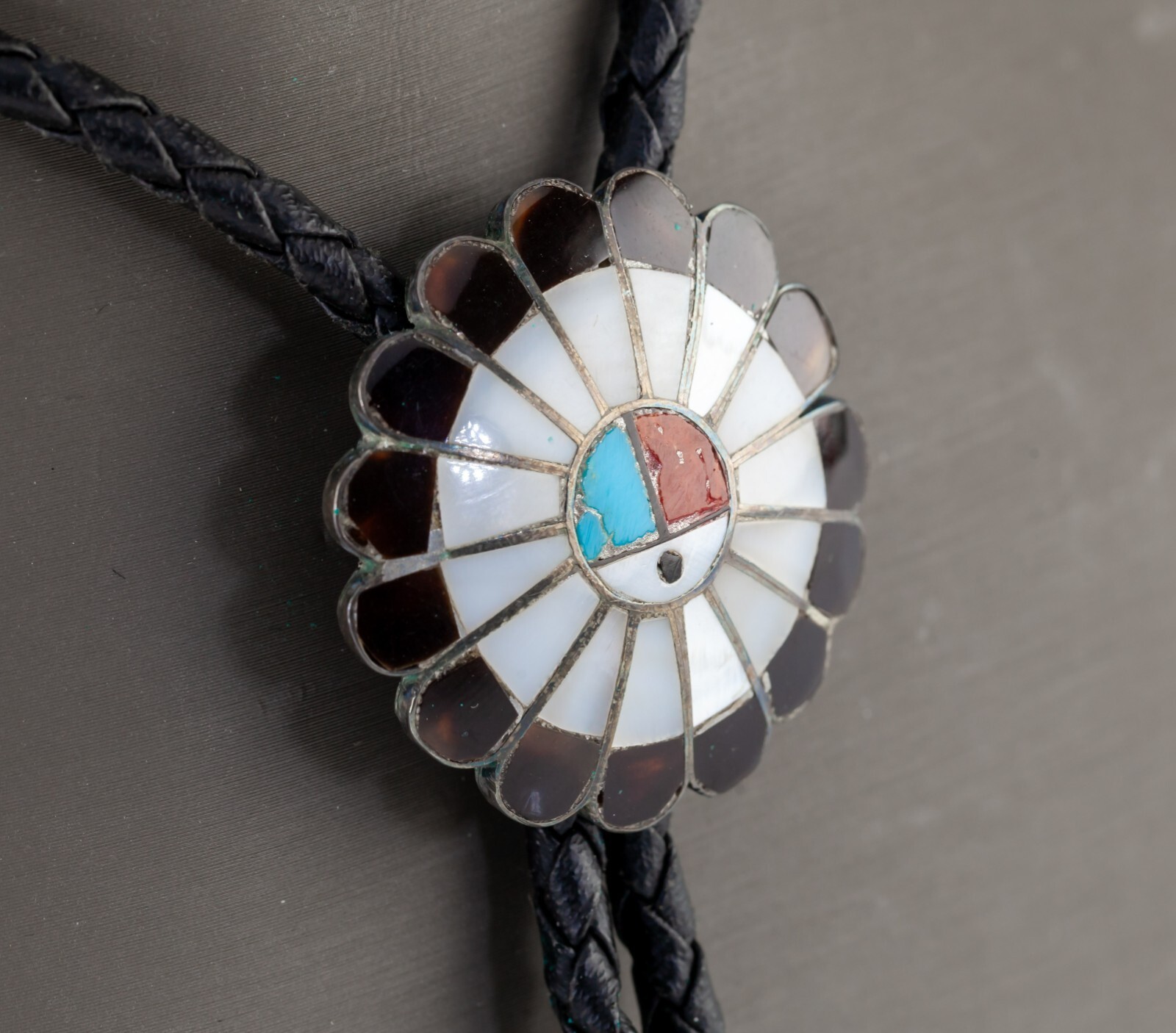 - Sterling Silver Navajo Lapidary Inlay Sun Bolo Tie Braided Leather