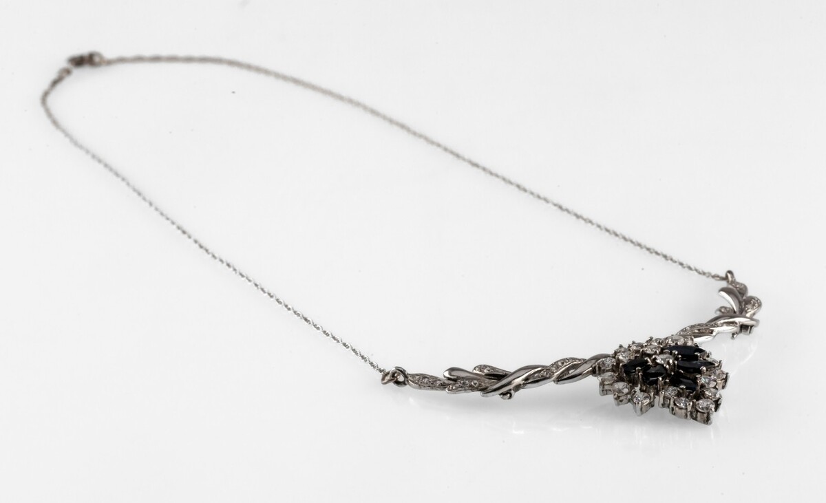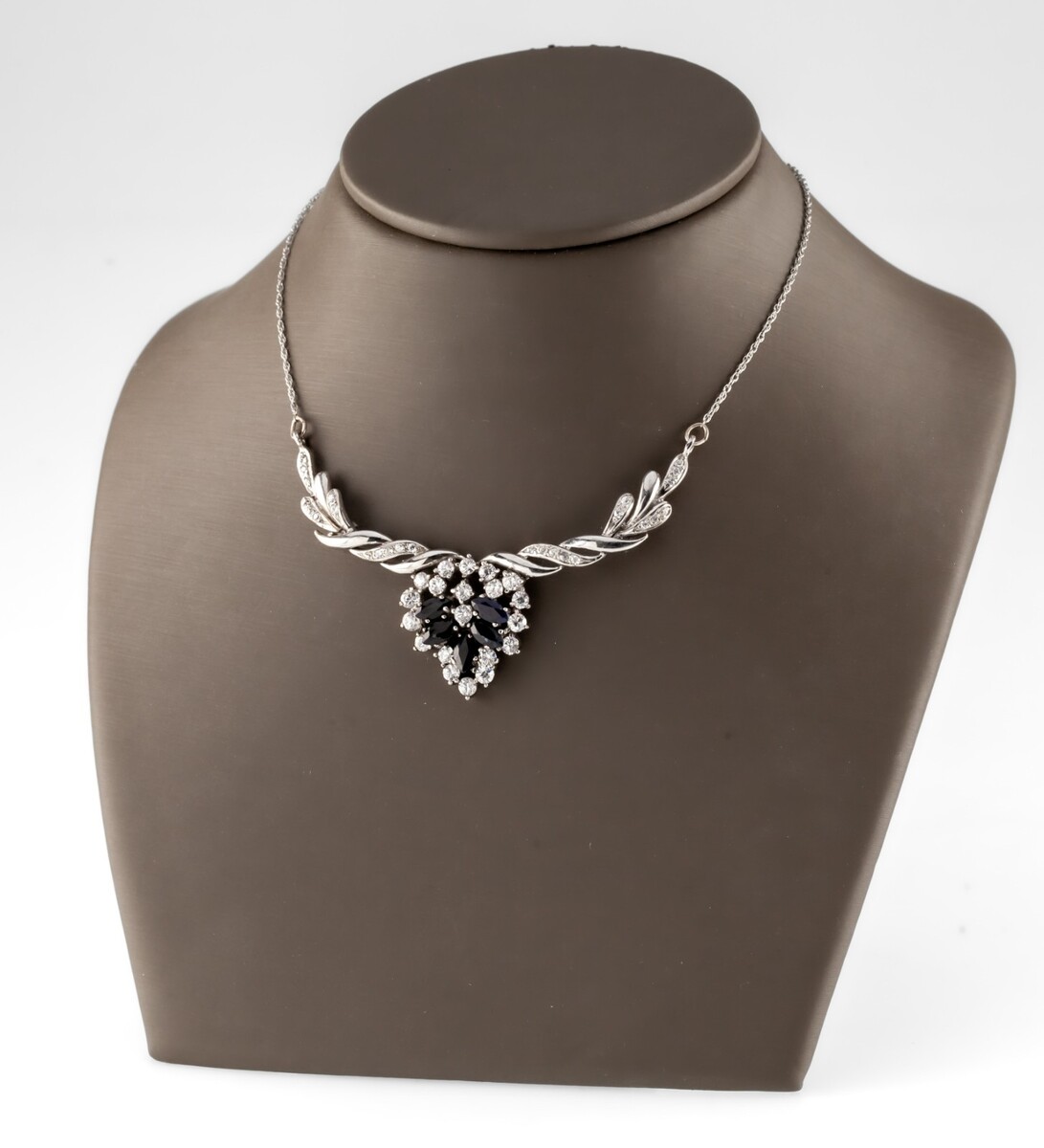 - Sterling Silver Necklace Leaf Cluster Design Blue Marquise Stones and CZ