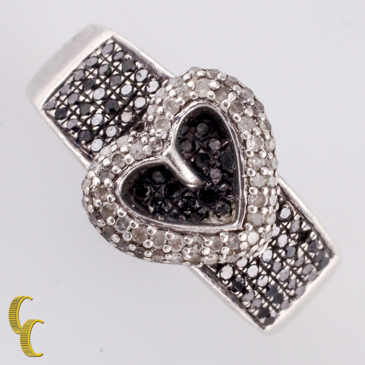 Sterlingsilber Schwarzer Und Weißer Diamant Herzförmiger Bandring Größe 8,75