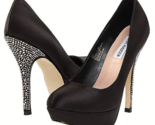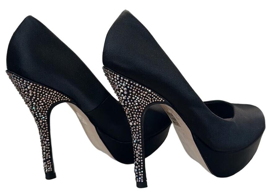 Keywords: Steve Madden heels, black stiletto pumps, rhinestone shoes, wedding heels, party shoes, formal footwear, designer heels, size 9.5, satin pumps, ultra high heels