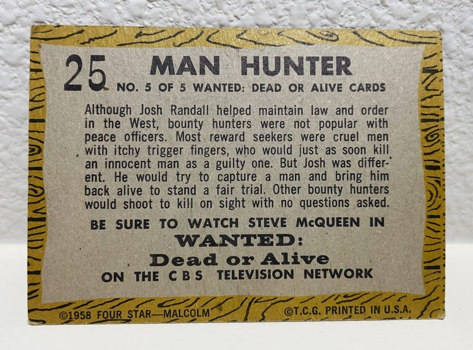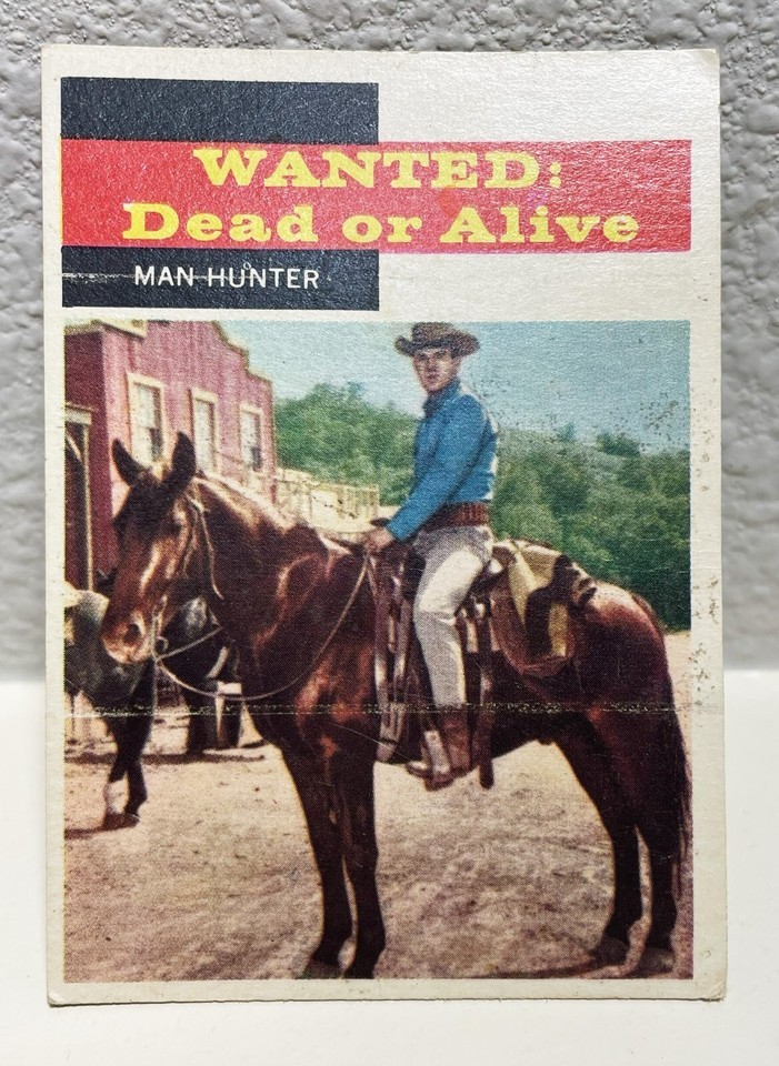 Vintage 1958 Steve Mcqueen WANTED: DEAD or ALIVE #25 TOPPS Western Card , Man Hunter 2-1/2 x 3-1/2 card stock. Two faint lines horizontal across the card but no indication of folders or creases.