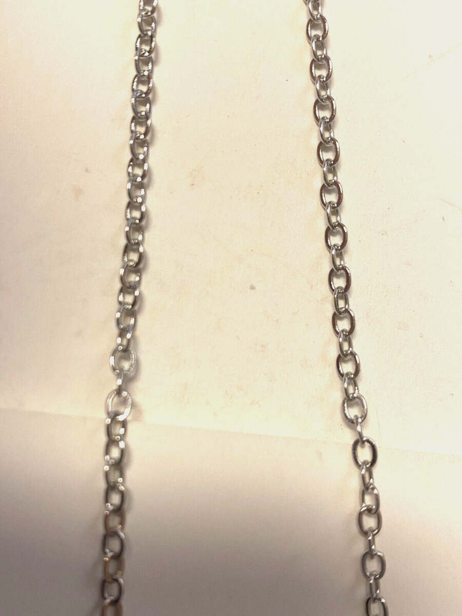 It measures approximately: 22" L. Comes with a 3 mm curb silver tone chain.