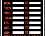 FOR SALE IS ONE (1) NEW STORE HOURS PLASTIC SIGN FOR DOOR OR WINDOW MANUFACTURED BY HY-KO PRODUCTS COMPANY MPN 3030 UPC# 029069110338. MEASURES 12" tall x 9" wide, MADE OF FLEXIBLE, HEAVY DUTY POLYSTYRENE WEATHER RESISTANT PLASTIC. LETS YOUR CUSTOMERS KNOW YOUR HOURS OF BUSINESS FOR EVERY DAY OF THE WEEK WITH BRIGHT FLUORESCENT ORANGE LETTERING AND YOU FILL IN THE BLANKS WITH YOUR HOURS. PLACE THIS ONE SIDED SIGN IN YOUR WINDOW, ON THE DOOR OR ATTACH TO POLE, CAN BE MOUNTED WITH TWO SIDED CUSHION TAPE OR STAPLED TO A WOODEN POLE. USE A BLACK SHARPIE MARKER TO FILL IN THE BLANKS. RESISTANT TO WEATHERING AND UV RESISTANT, STURDY CONSTRUCTION. HY-KO PRODUCTS COMPANY OF NORTHFIELD OHIO HAS BEEN MAKING QUALITY SIGNS SINCE 1949. PURCHASE TWO SIGNS AND YOU CAN HAVE TWO SCHEDULES, ONE FOR SUMMER AND ONE FOR WINTER. YOU WILL RECEIVE ONE (1) STORE HOURS PLASTIC SIGN SHIPPED BY USPS FIRST CLASS MAIL.....