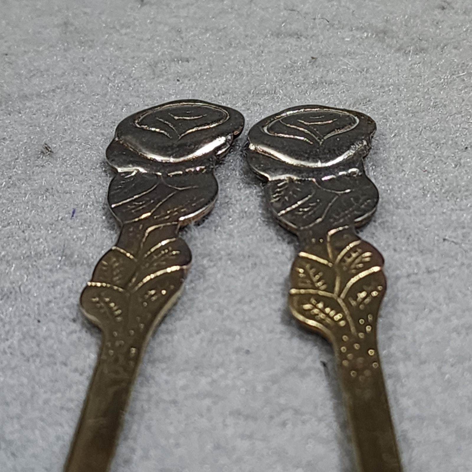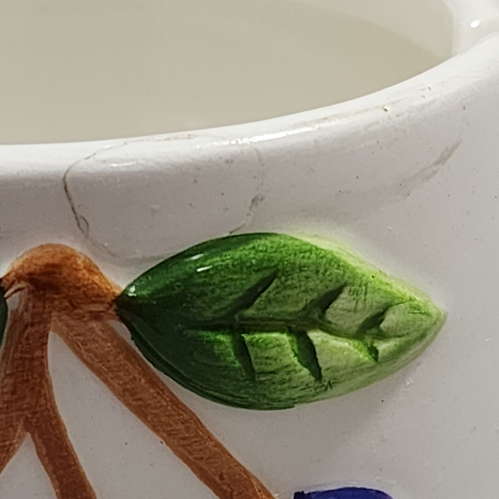 Preowned with minor flaws. Tops of spoons are slightly discolored due to oxidation and Blueberry jar has crack in glaze, but does not go all the way through, as seen in photos. Otherwise, in good condition.